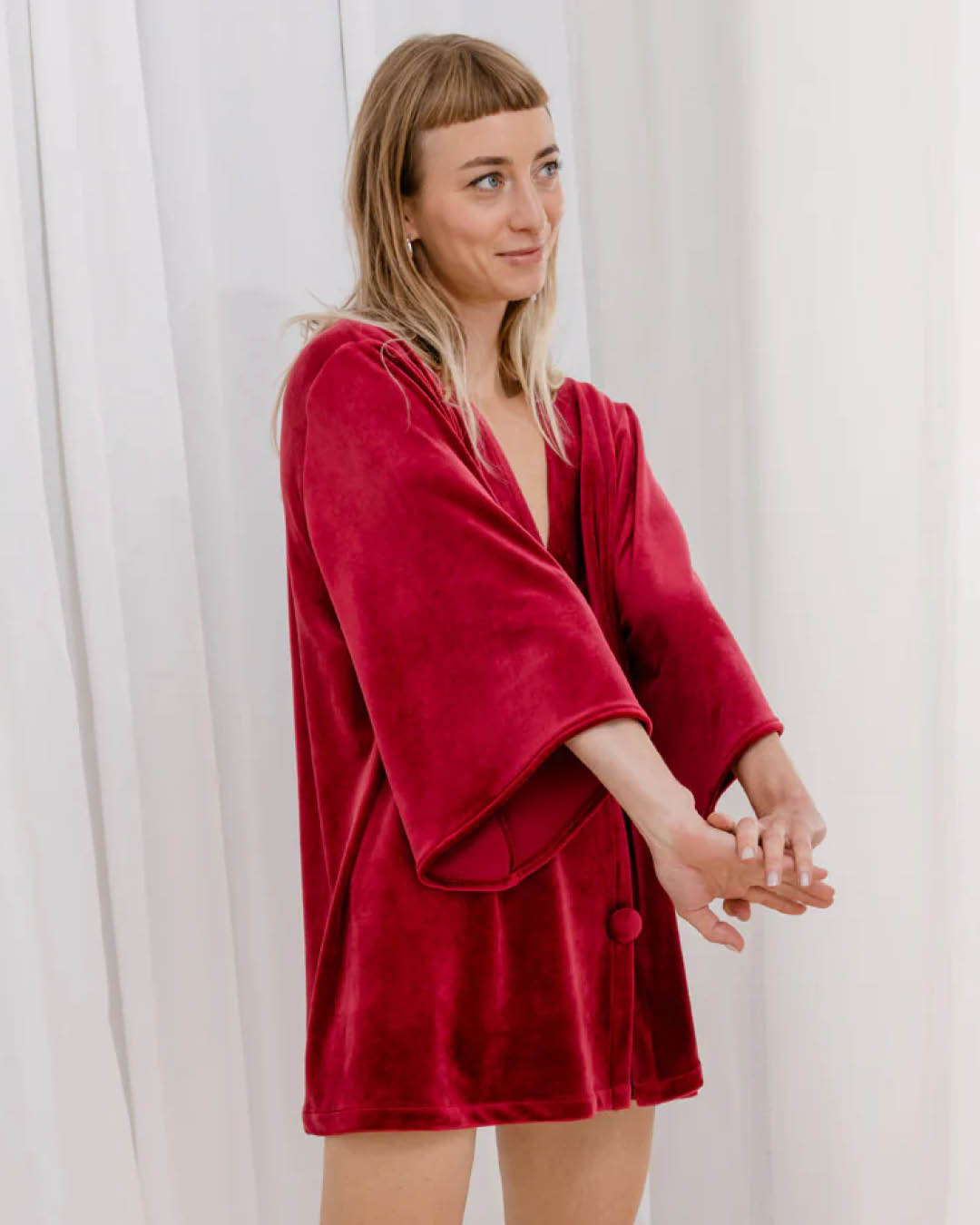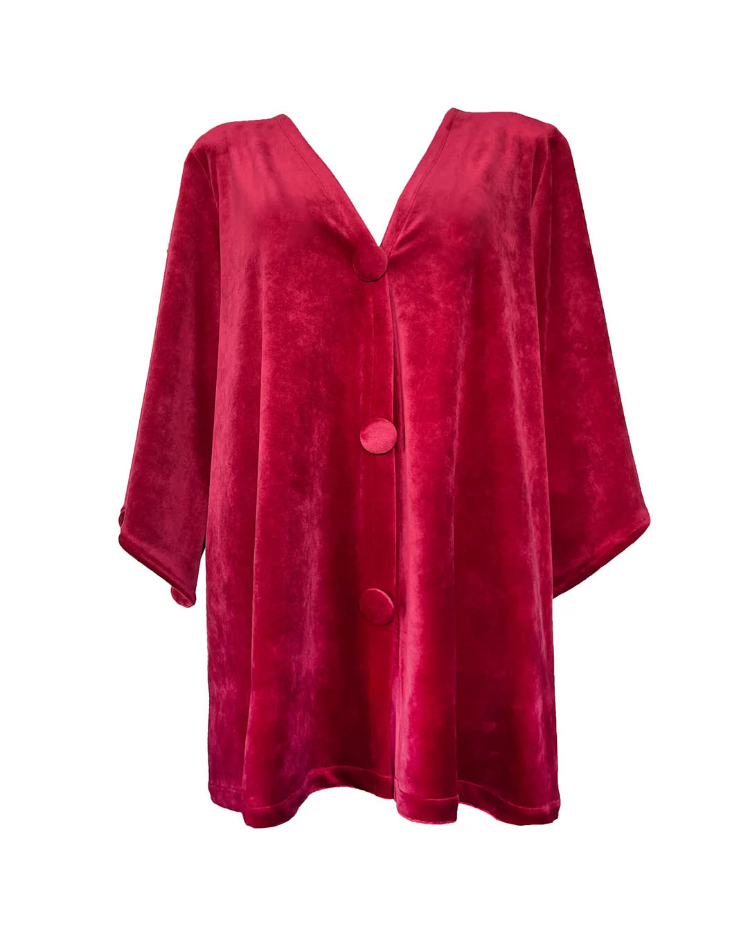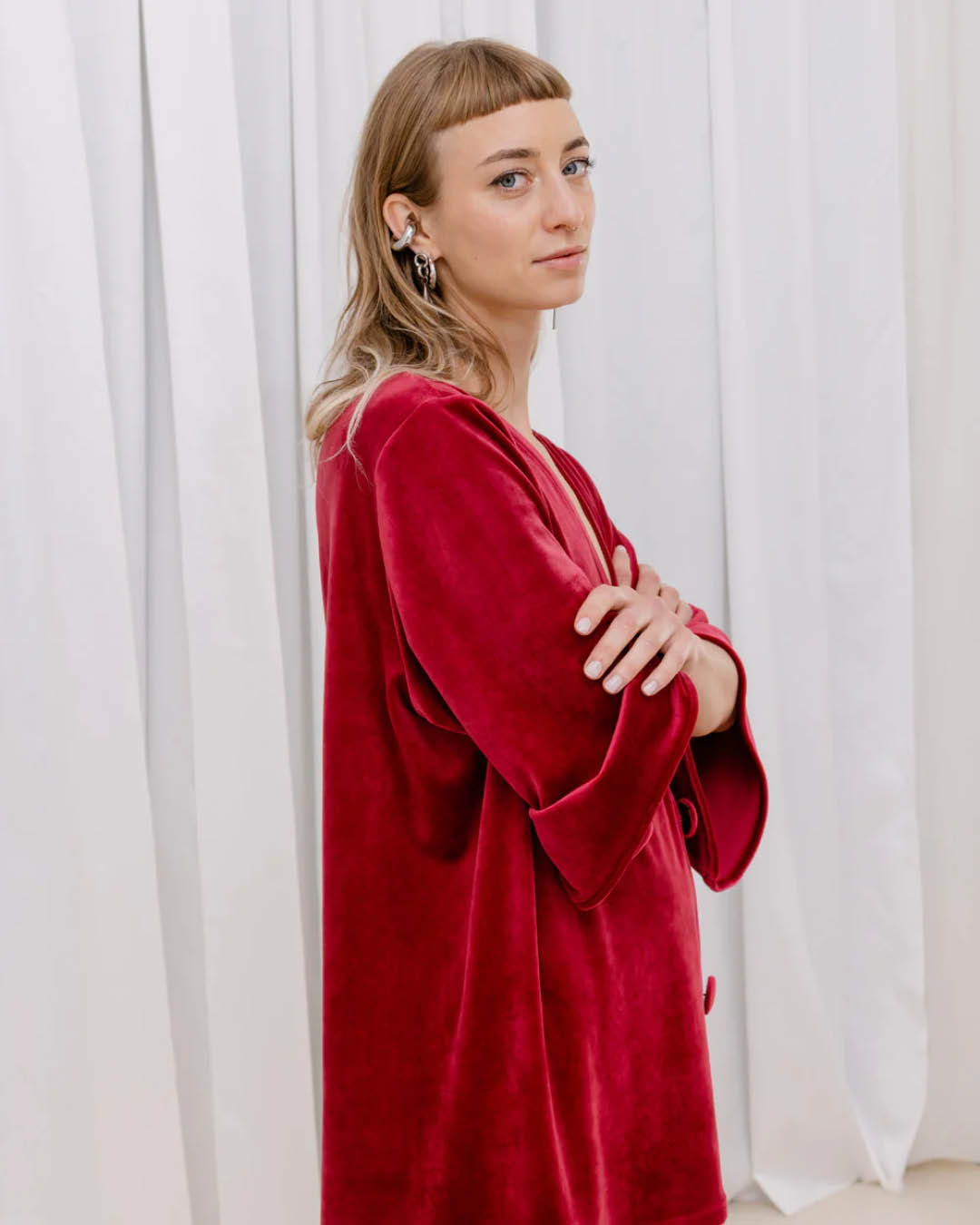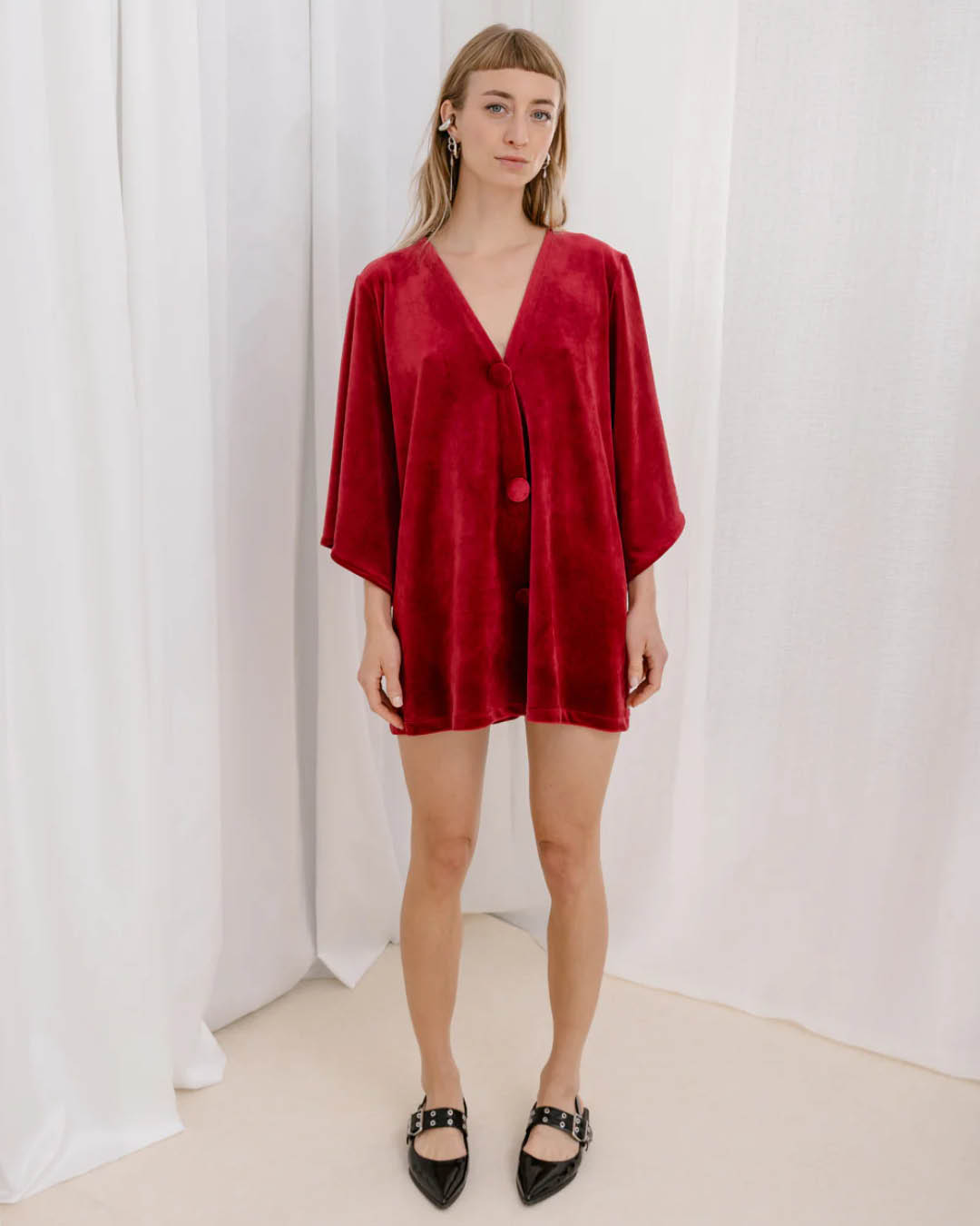 Kimono inspired jacket in extra soft plush velour by Kriss Soonik. Front opening with large buttons and closable with black metal snaps. 3 large plush velour covered buttons in front. Hidden black metal snaps. Material: 92% Polyester, 8% Elastane. Machine wash cold. Do not tumble dry. Stretch into shape after washing. Made in Estonia.