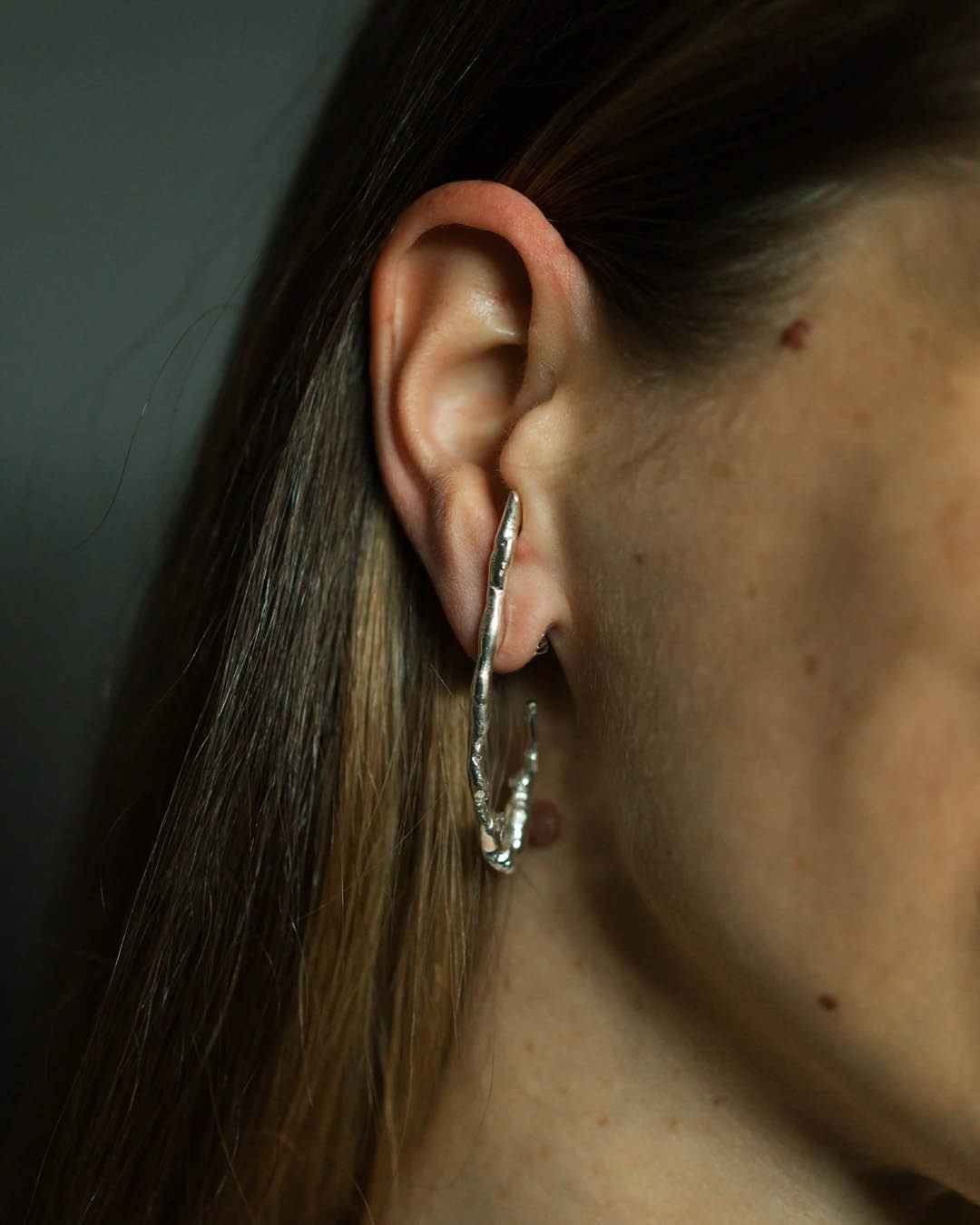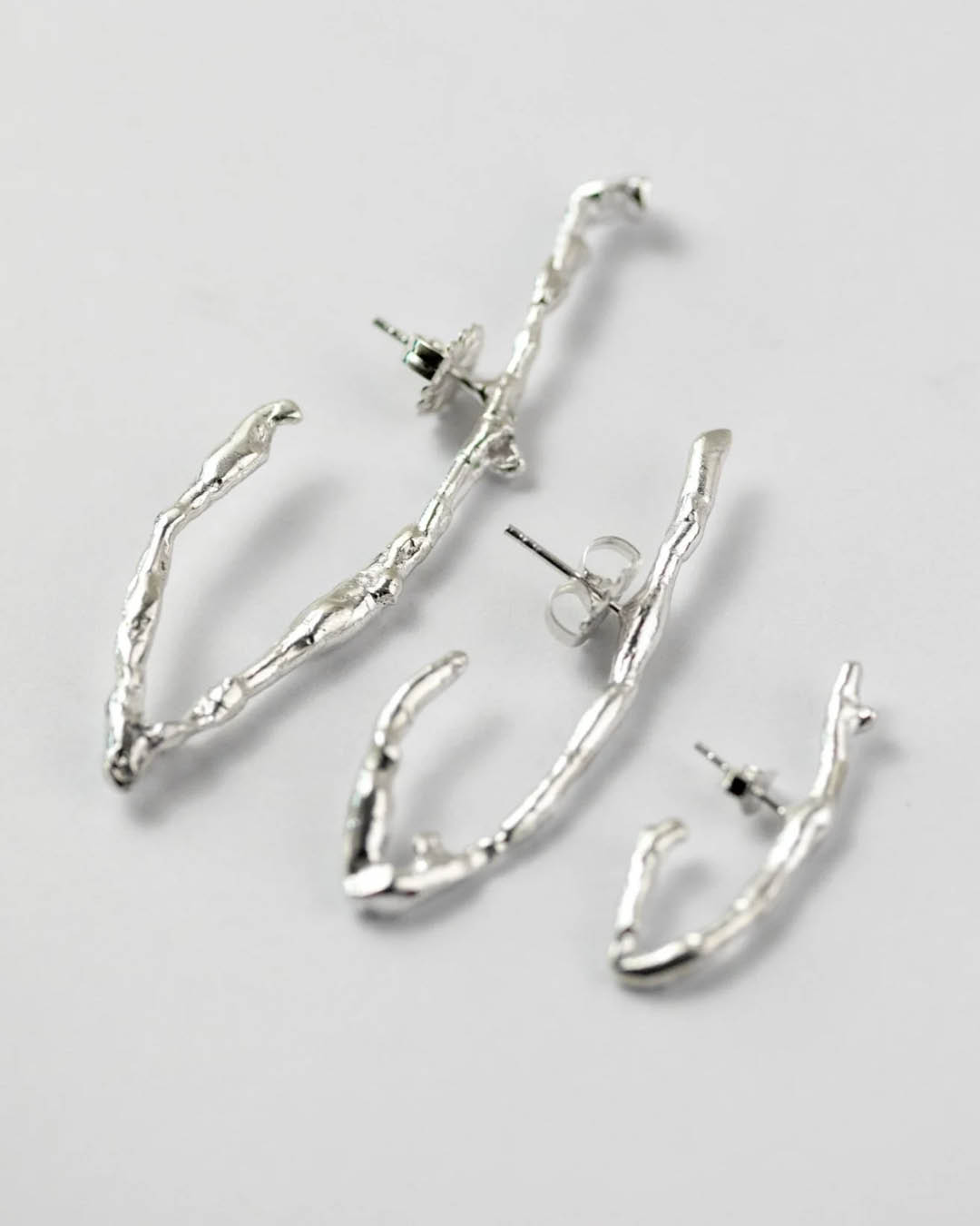 Arch Earrings by Claudia Lepik are made of 925 sterling silver. Architectural earrings with multiple possible ways of wearing. They are accompanied with wide backings for comfortable wear. Each earring is unique and may differ slightly from the photos. Measurements: 5.1x1.6 cm. Weight: 3.4-3.7 g.