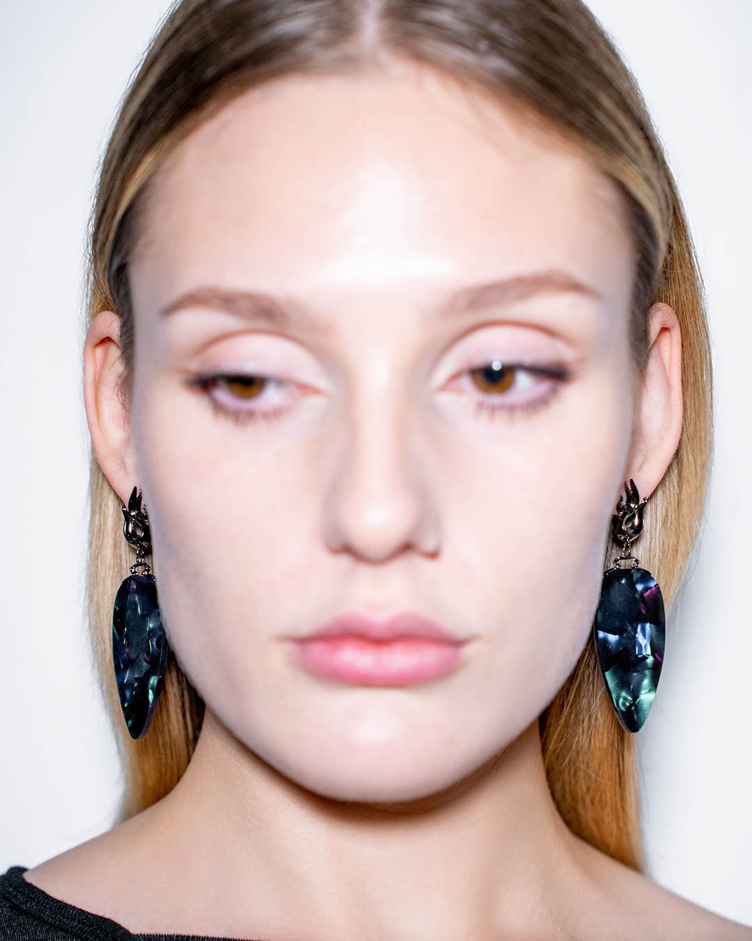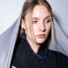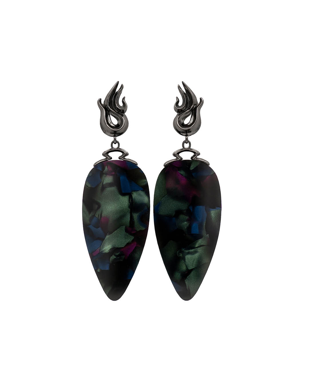 Chönyi Earrings Dark Cosmic Drop Black Vermeil by NRTN. Size: 70 × 22 × 3.6 mm each. 925 Sterling Silver. Dark Cosmic Acrylic. Dark Rhodium Vermeil. Collection BARDO – jewellery shaped from sterling silver and semi-precious gems, where craftsmanship meets spirit. Inspired by the Bardo – the liminal space between life and death – it reflects the mountain’s stillness, transformation, and the quiet poetry of rebirth.