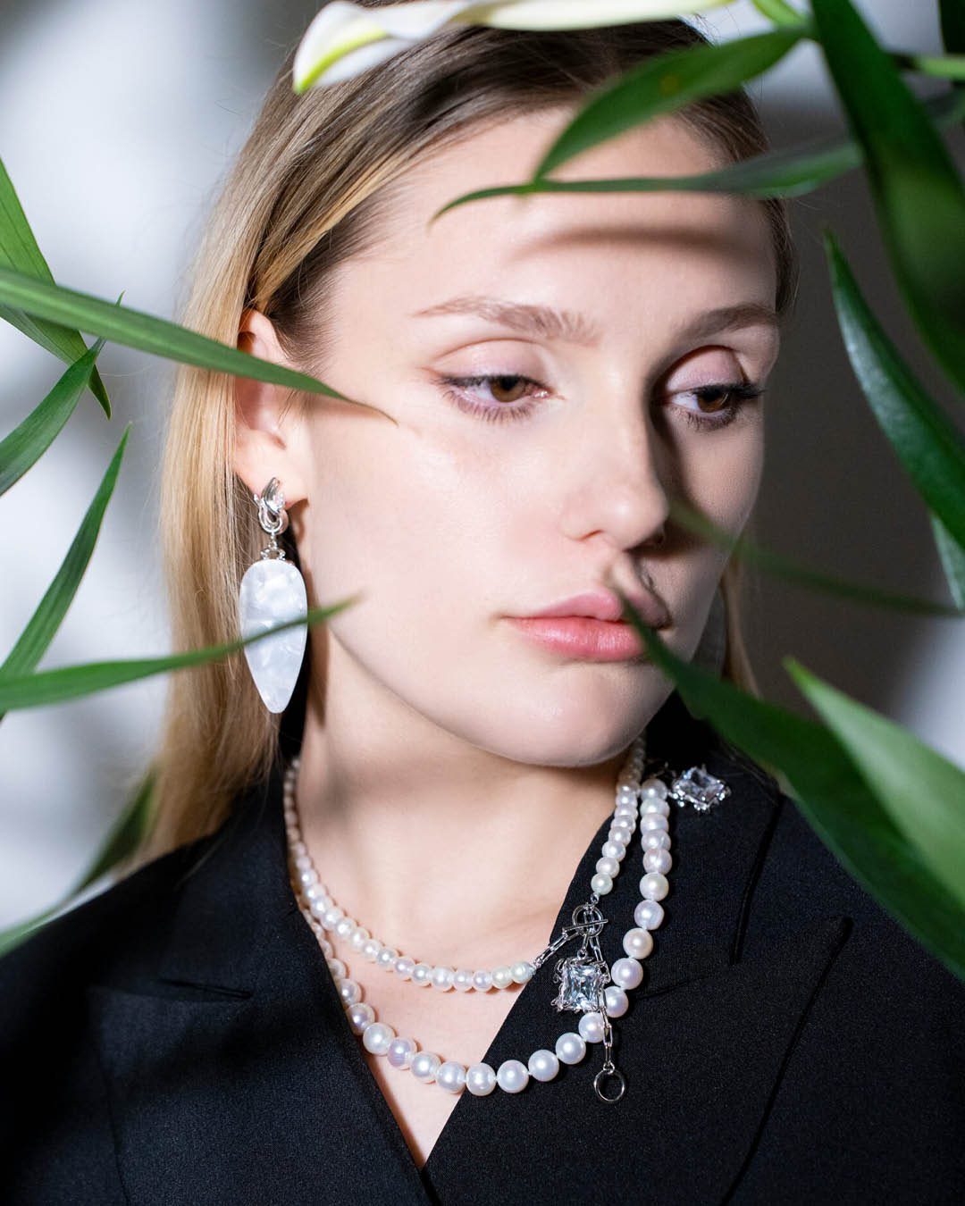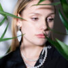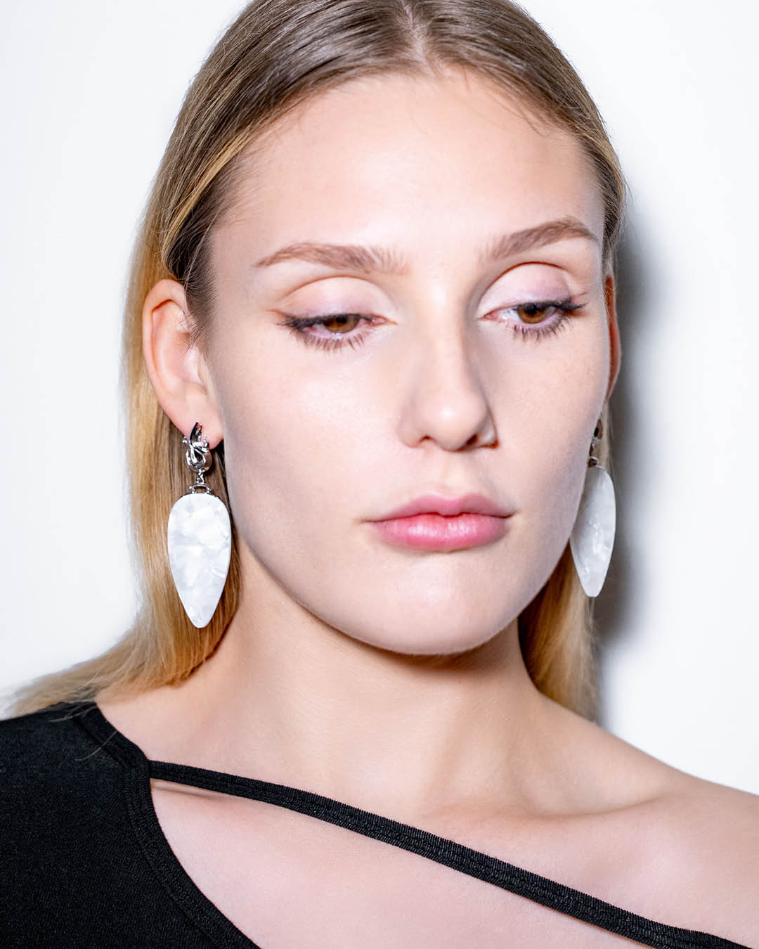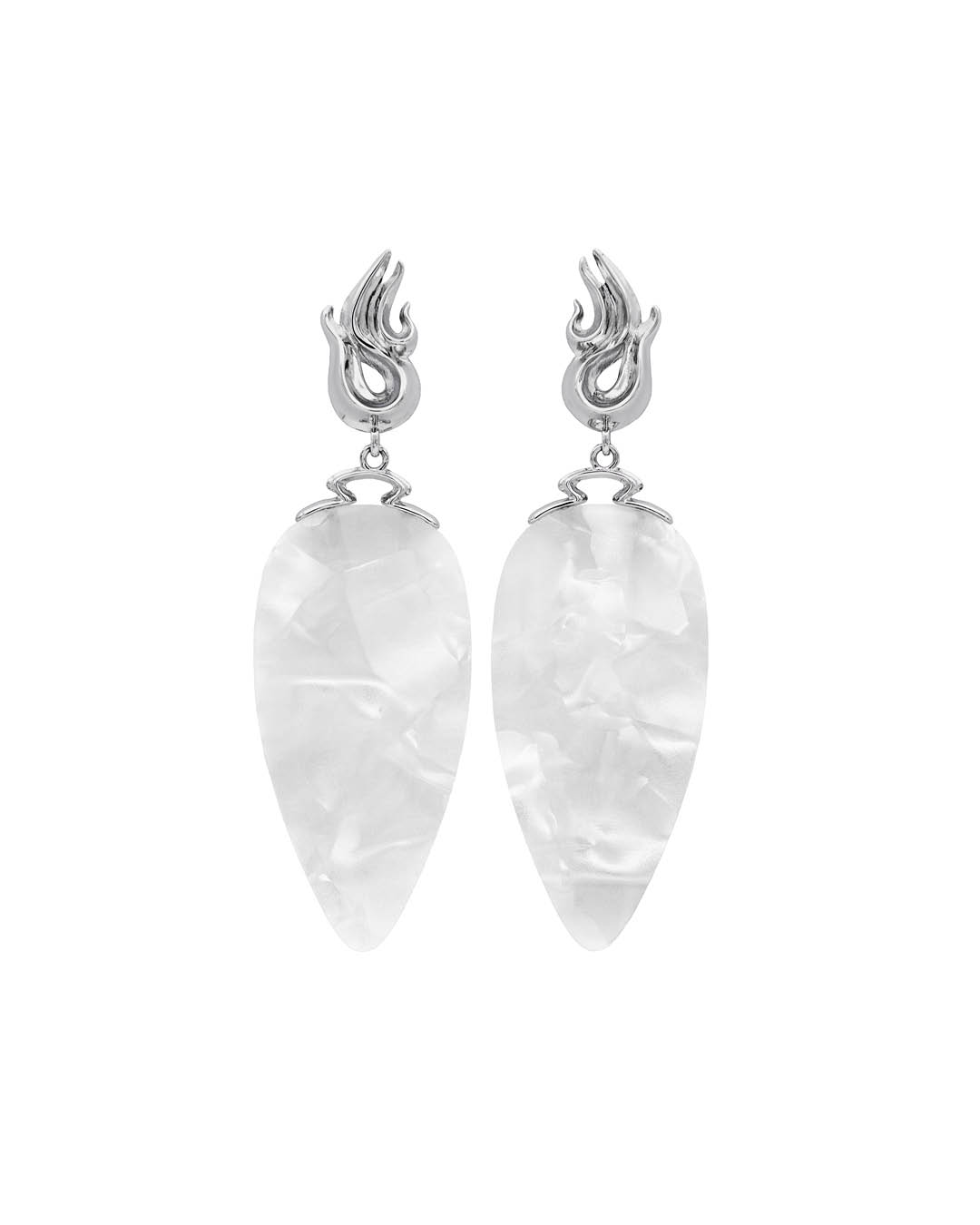 Chönyi Earrings Pearly Drop Rhodium Vermeil by NRTN. Size: 70 × 22 × 3.6 mm each. 925 Sterling Silver. White Pearlescent Acrylic. Rhodium Vermeil. Collection BARDO – jewellery shaped from sterling silver and semi-precious gems, where craftsmanship meets spirit. Inspired by the Bardo – the liminal space between life and death – it reflects the mountain’s stillness, transformation, and the quiet poetry of rebirth.