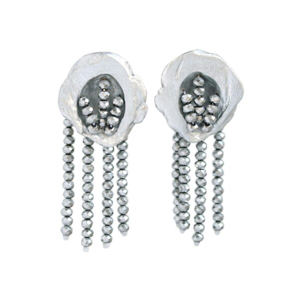 Earrings from Kaia Saarna’s jewellery collection Exotic Fruits are one of a kind. Earrings are made from original nectarine stone and silver 925. Every earrings pair are unique because every nectarine stone is non-recurring as in nature. Earrings are for pierced ears. Material: silver 925, hematite, nectarine stone. Measures: 3 cm x 6 cm. Weight: 21,5 g.
