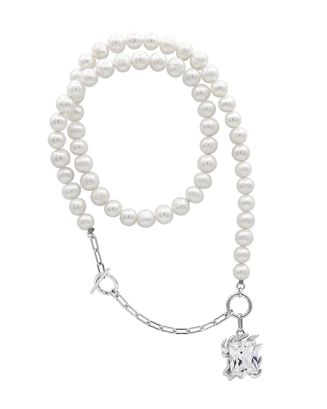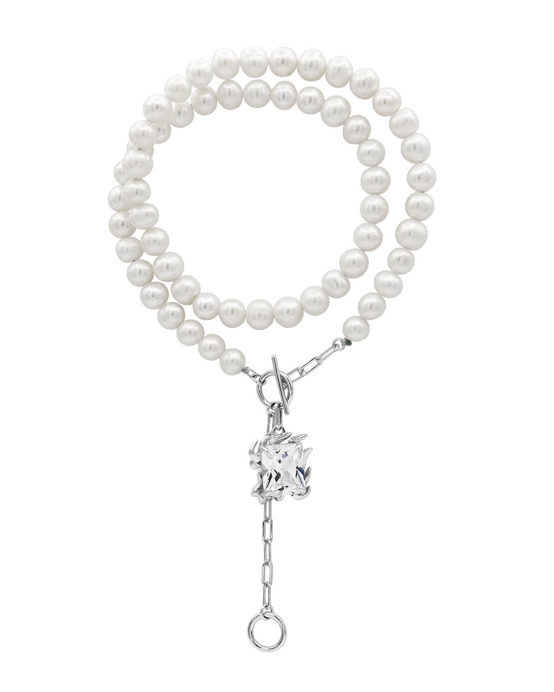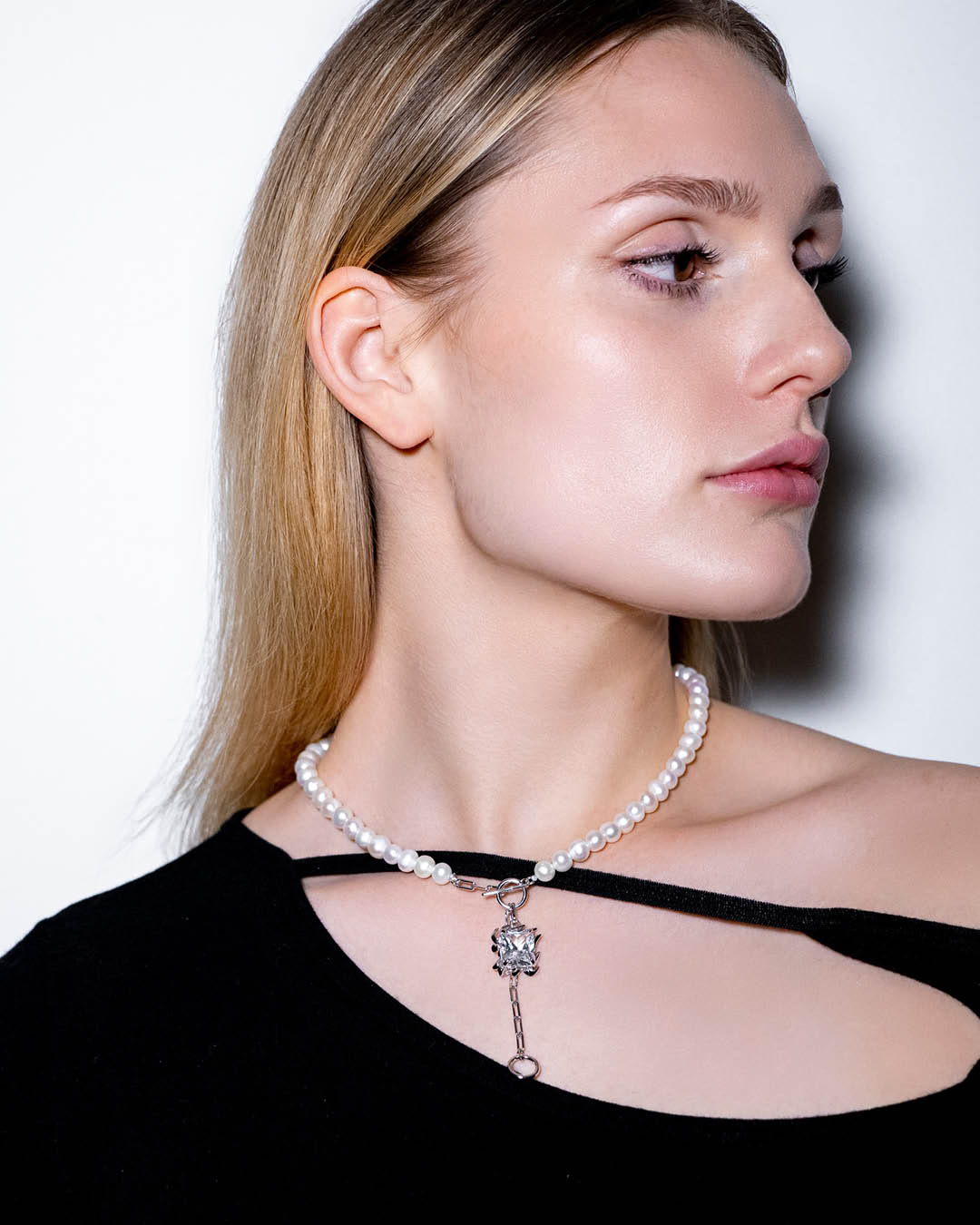 KYENAY Pearl Necklace by NRTN is crafted with genuine freshwater pearls. Each strand is hand-tied in our Tallinn studio radiant and versatile, featuring two wearing lengths that effortlessly transition from office attire to evening events. Size: 160 × 160 × 7 mm / Wear Length: 42 and 47 cm. Materials: 6–7 mm Freshwater Pearl, Clear Corundum Gem, 925 Sterling Silver, Rhodium Vermeil. Collection BARDO – jewellery shaped from sterling silver, pearl and semi-precious gems, where craftsmanship meets spirit. Inspired by the Bardo – the liminal space between life and death – it reflects the mountain’s stillness, transformation, and the quiet poetry of rebirth.