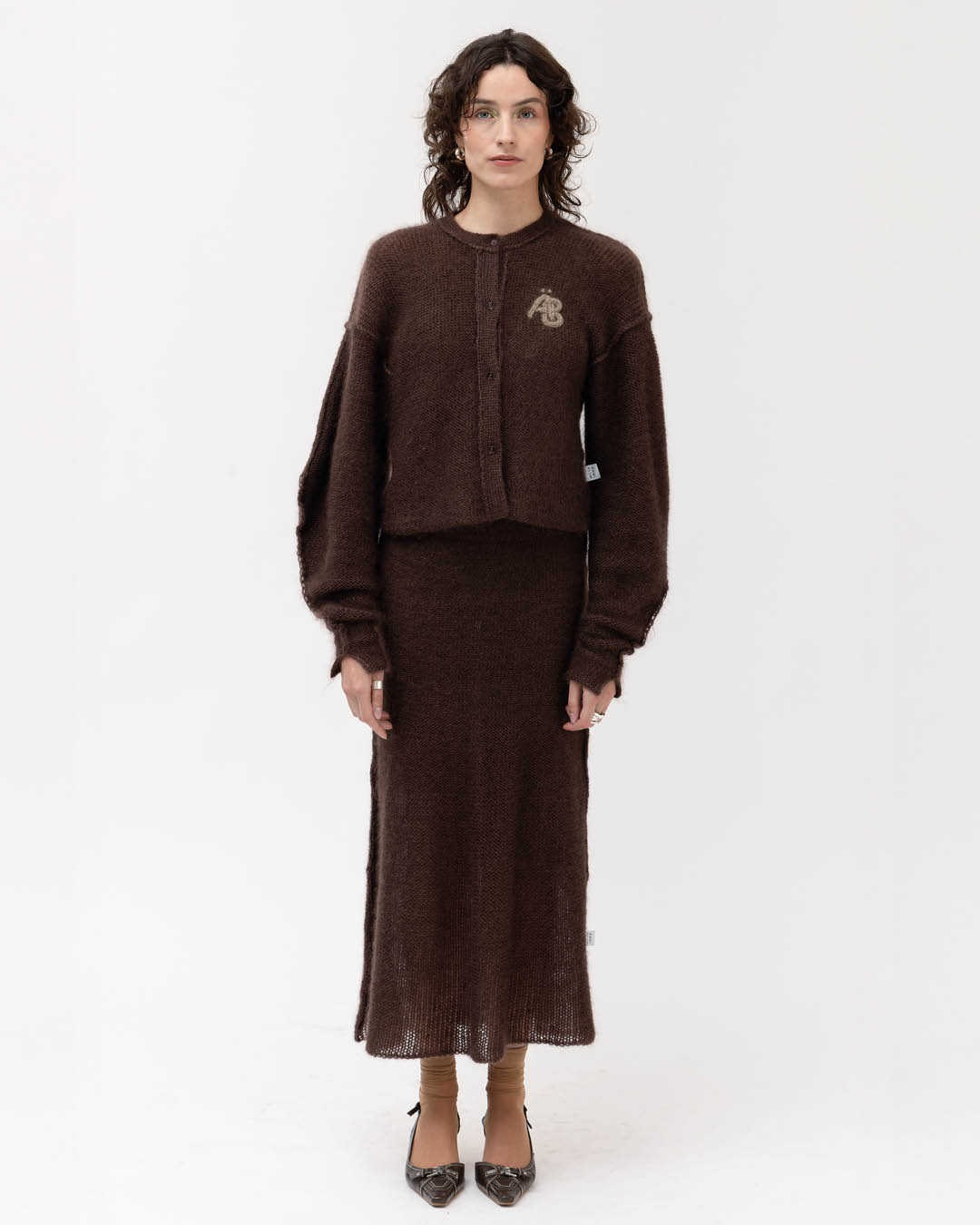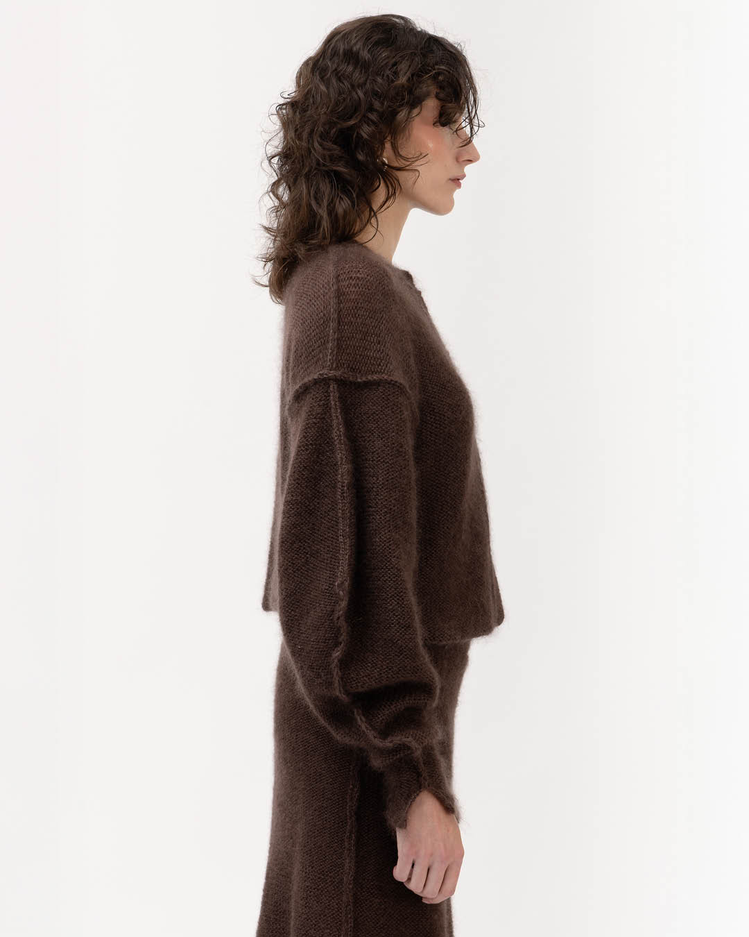 Knitted from exclusive Japanese silk mohair, the ultra-soft and lightweight Molly cardigan by Ärni Blum is an ideal choice even for the most sensitive skin. With its feminine and classic silhouette, this cardigan is perfect for any occasion. Thoughtful details add character – a hand-embroidered Ärni symbol on the chest, exposed seams, and voluminous half-moon-shaped sleeves with small slits at the cuffs. Designed and knitted in Saaremaa, Estonia. Material: 65% mohair, 35% silk.