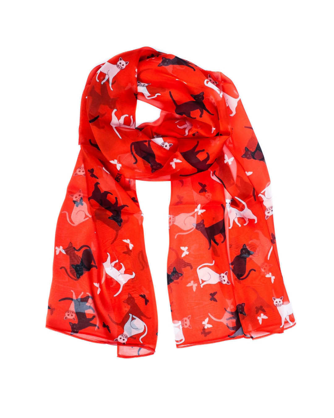A lightweight, slightly transparent red silk scarf with cats from the brand Bsurd. Material: 100% silk chiffon. Dimensions: ~65 x 180 cm. Digitally printed. Hand wash at no more than 30°C. Iron the fabric on the reverse side at low temperature or gently through another cloth. Move the iron quickly across the fabric and do not use steam. If possible, avoid ironing silk and let it dry hanging instead. Do not dry in direct sunlight. The BSURD brand was born at the beginning of 2013 out of a love for patterns. Many patterns had actually already been created by then, but there was no idea yet where to apply them. Since Estonia’s weather requires wearing something around your neck most of the time, it might as well be something personal and cool. The concrete product ideas usually come from a need – either my own or that of friends – for something specific. The idea for the scarves likely arose while tying an uninspiring, plain-colored scarf in front of the mirror. – Heidi Mänd