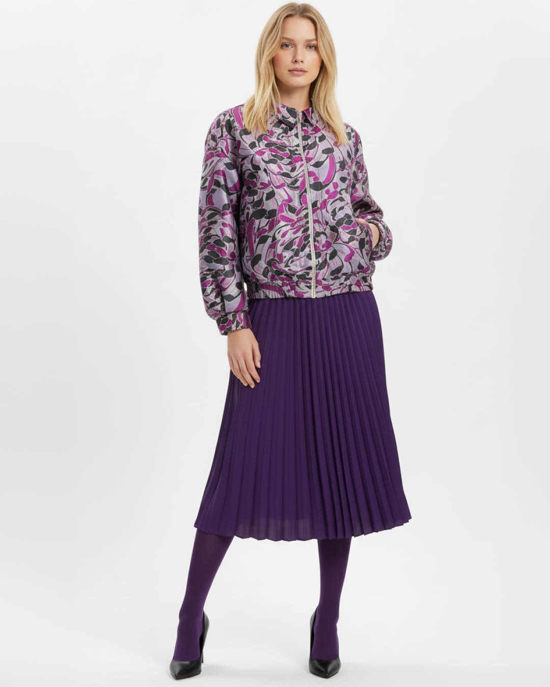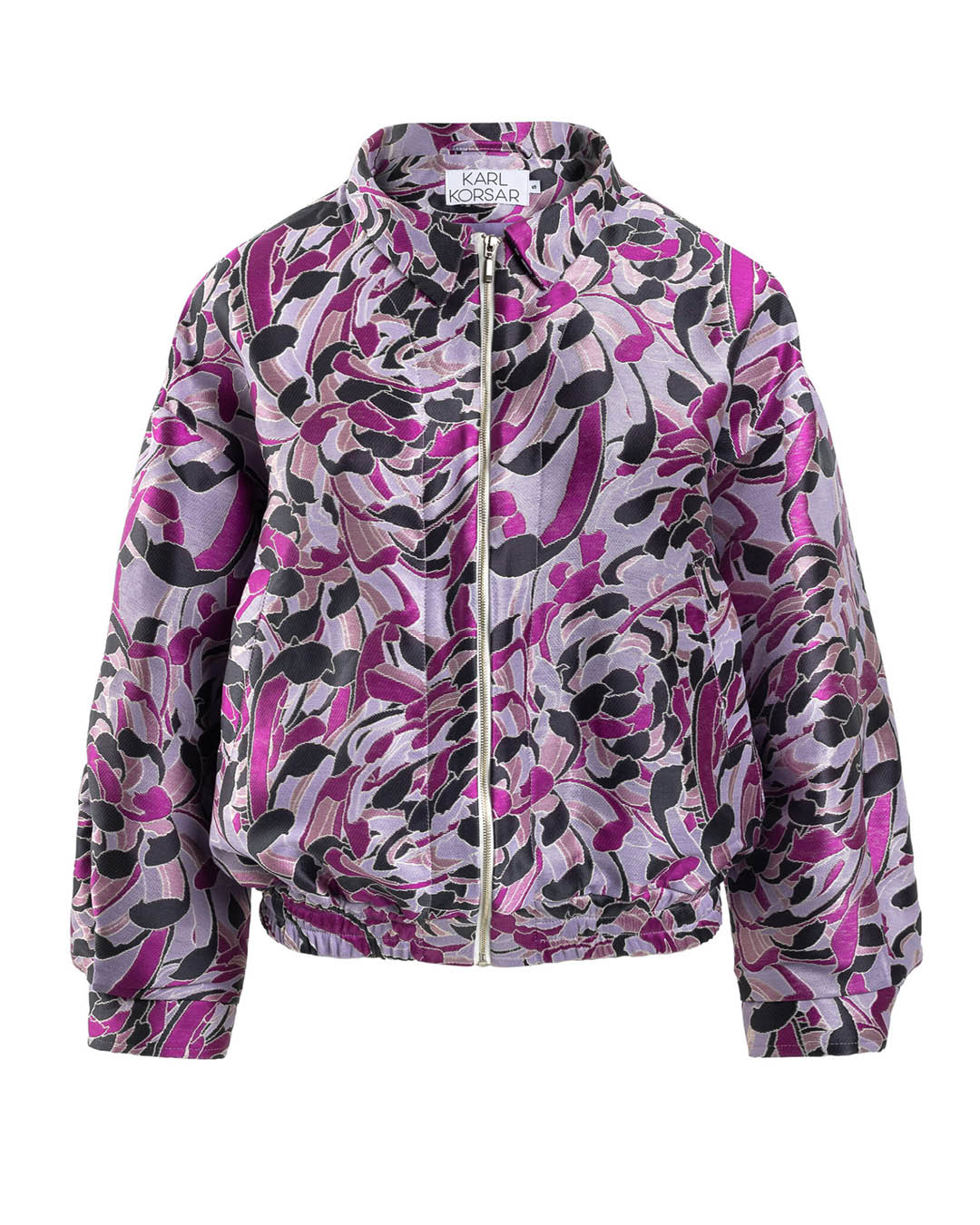 Efektne bomberjakk on valmistatud Karl Korsari eritellimusel loodud žakaarkangast, muutes kantava kunsti modernseks moeloominguks. Lillade, mustade ja pehmete metalltoonide keerukas mäng loob dünaamilise, skulpturaalse pinna, mis ärkab liikumises ellu. Sile ja siidine vooder lisab kandmismugavust, võimaldades jakil pingutuseta üle naha libiseda, säilitades samal ajal struktureeritud ja mahuka silueti. Poleeritud esilukk ning rätsepatööna valminud elastsed detailid tasakaalustavad luksuslikkuse ja kaasaegse kerguse. Materjal: 66% puuvill, 34% polüamiid. Vooder: 100% viskoos. Kangas valmistatud Comos, Itaalias. Õmmeldud Tallinnas, Eestis.