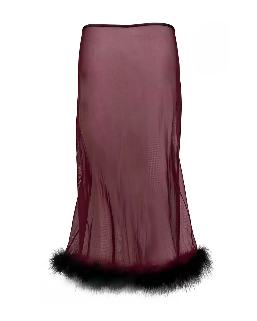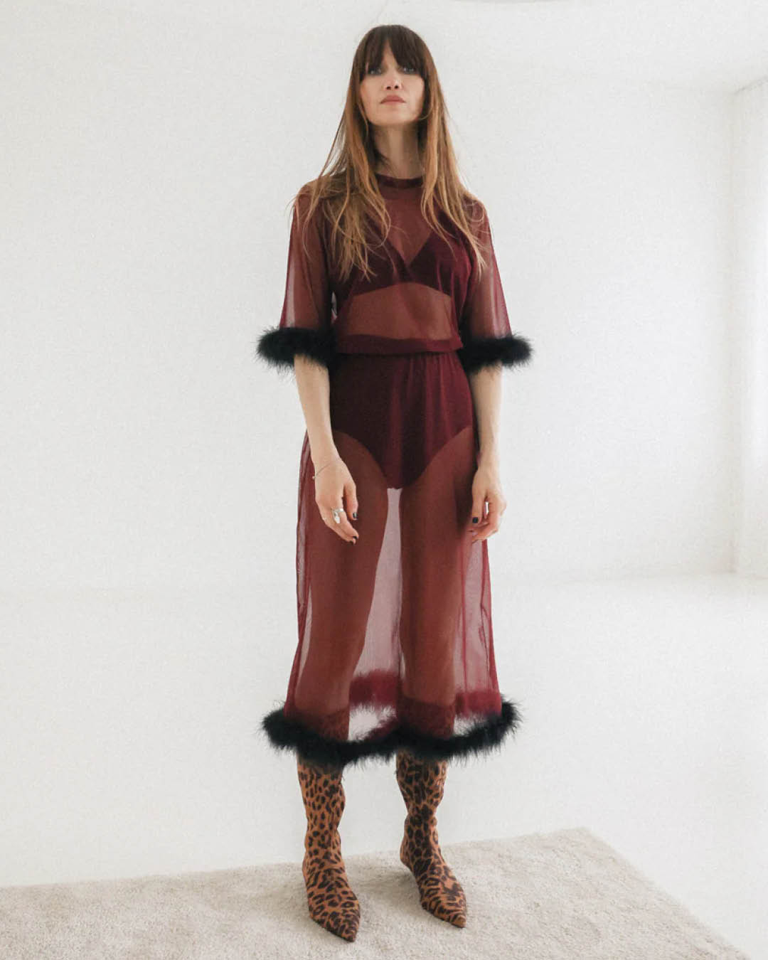 Kriss Sooniku burgundi võrkkangast seelik Harriet on piiratud koguses valmistatud taaskasutus-toode. Valmistatud vaid 10 võrkkangast seelikut burgundi toonis. Kõik eksemplarid on nummerdatud. Materjal: 90% polüester, 10% elastaan. Marabou kaunistus ei ole eemaldatav. Marabou sulgede pesu ei ole soovitatav. Seelikut tuleks puhastada kohtpuhastusega. Kui siiski pesed sulgi käsitsi, palun töötle neid hiljem auruga, et kohevust taastada. Valmistatud Eestis. See disain sündis Krissi 5-nädalase disainiväljakutse tulemusena – taaskasutusprojekt, kus loodi limiteeritud kollektsioon ainult varasemate kollektsioonide kangajääkidest. "See algas kevadpuhastusega ja lõppes sellega, et olin põlvini trikookangaste, pitsijääkide ja veidi dramaatilise missiooniga taaskasutada kõik meie kangavarud." – Kriss