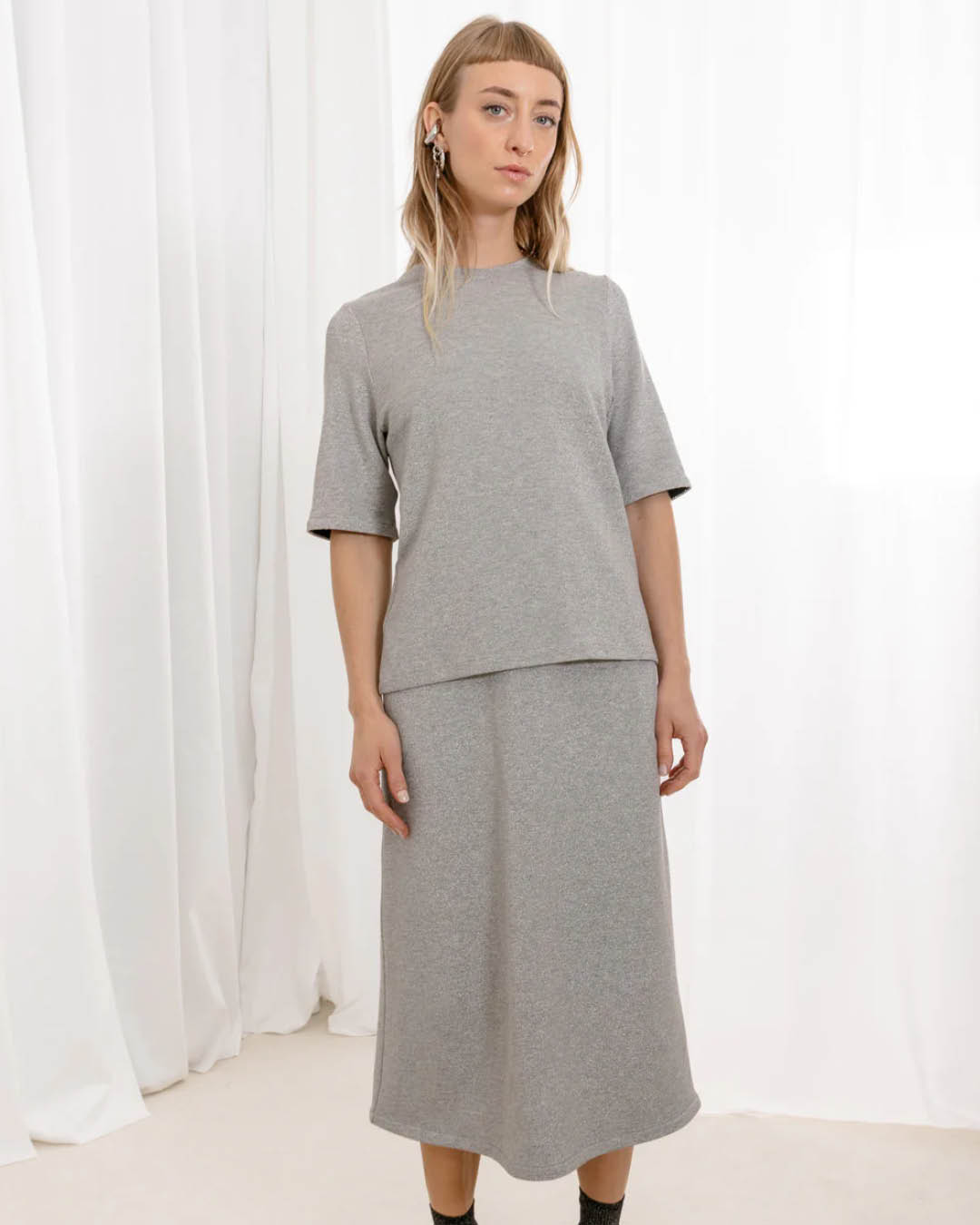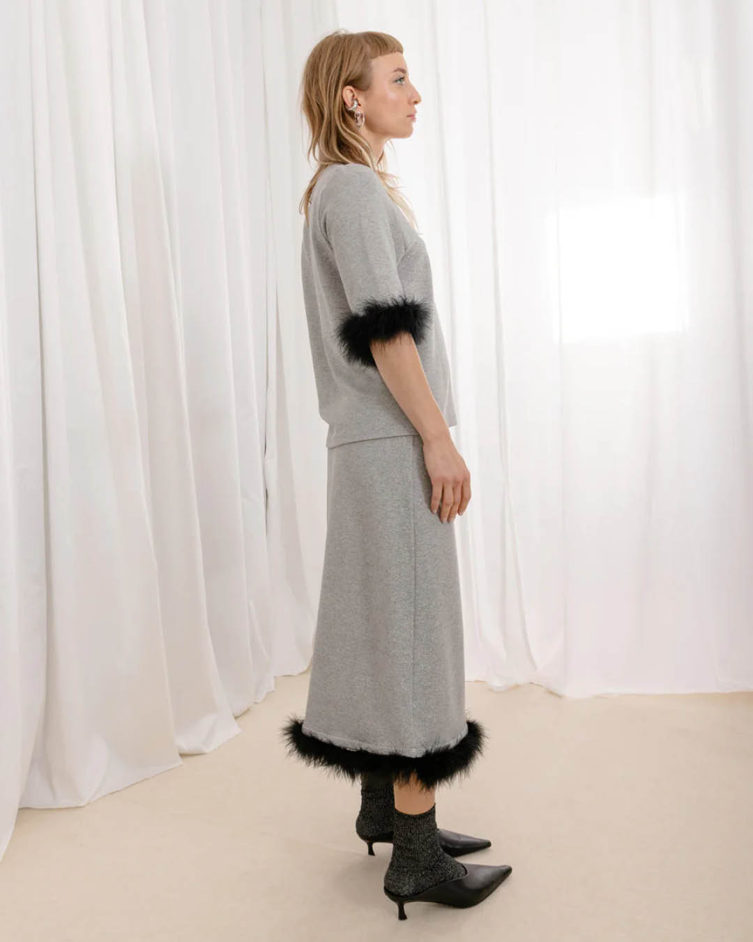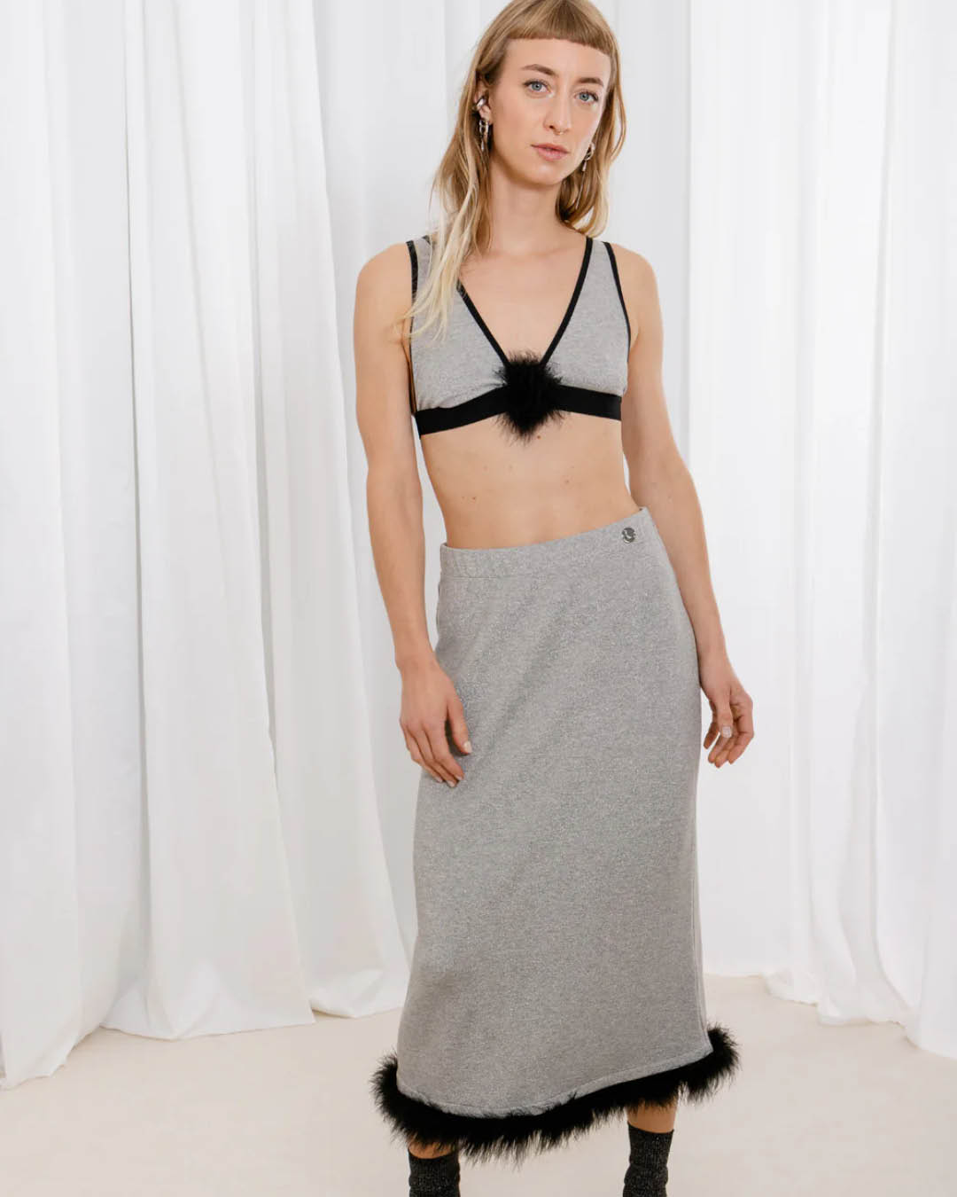 Kergest hõbedaselt sädelevast kangast Kriss Sooniku pliiatslõikeline seelik, mida kaunistavad eemaldatavad marabusuled. Sulgede kaunistus on eemaldatatavate konkskinnitustega. Materjal: 41% viskoos, 31% polüamiid, 6% elastaan, 22% metallniit. Hooldus: masinpesu 30 °C juures (eemalda marabusuled enne pesu). Valmistatud Eestis.