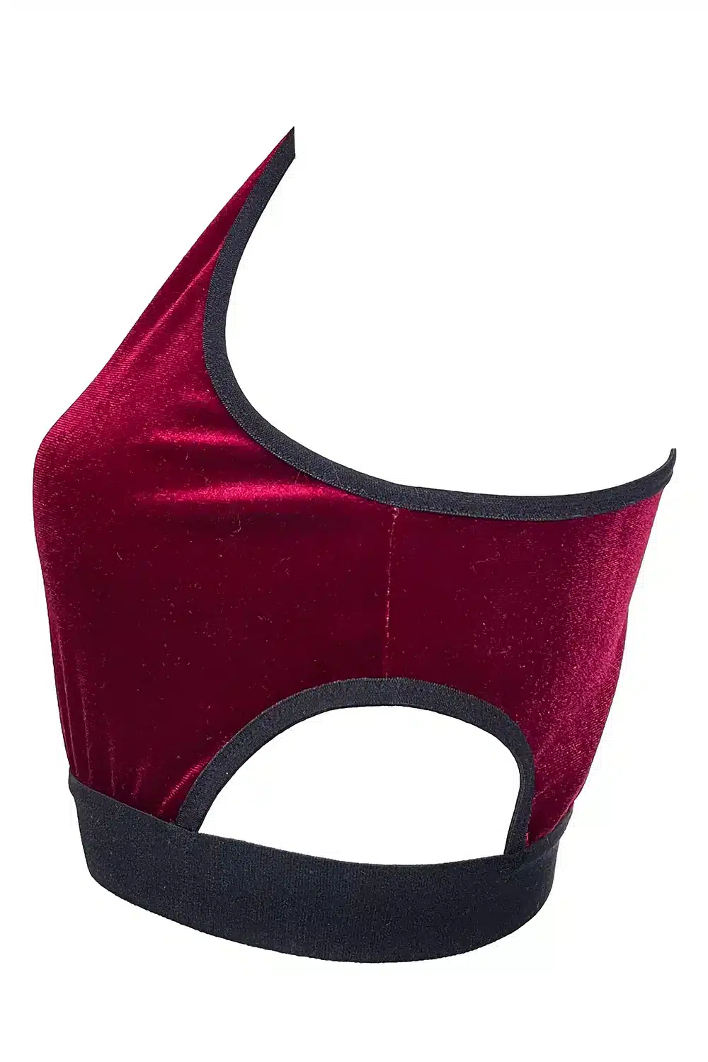 Sametist rinnahoidja kuldse klambriga ja väljalõigetega külgedel. Saab kanda nii, et traksiklambri detail on suunatud ette või taha. Rinna all lai elastne toestus. Külgedel väljalõiked. Kuldsed metalldetailid. Valmistatud Eestis. Materjal: 93% polüester, 7% elastaan. Ainult käsipesu. Vastab suurusele.