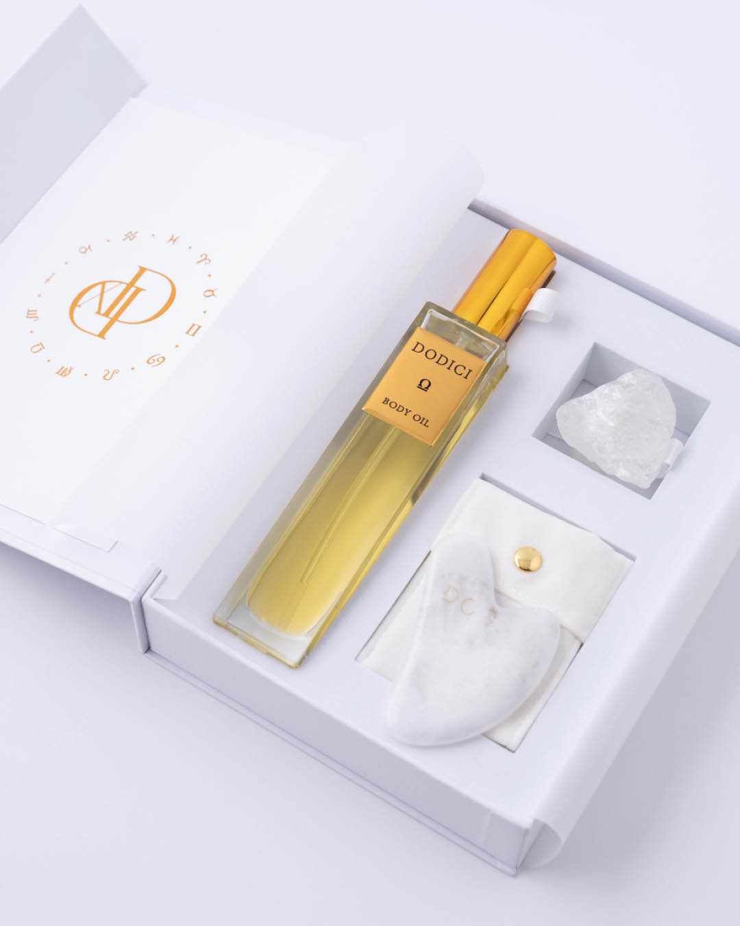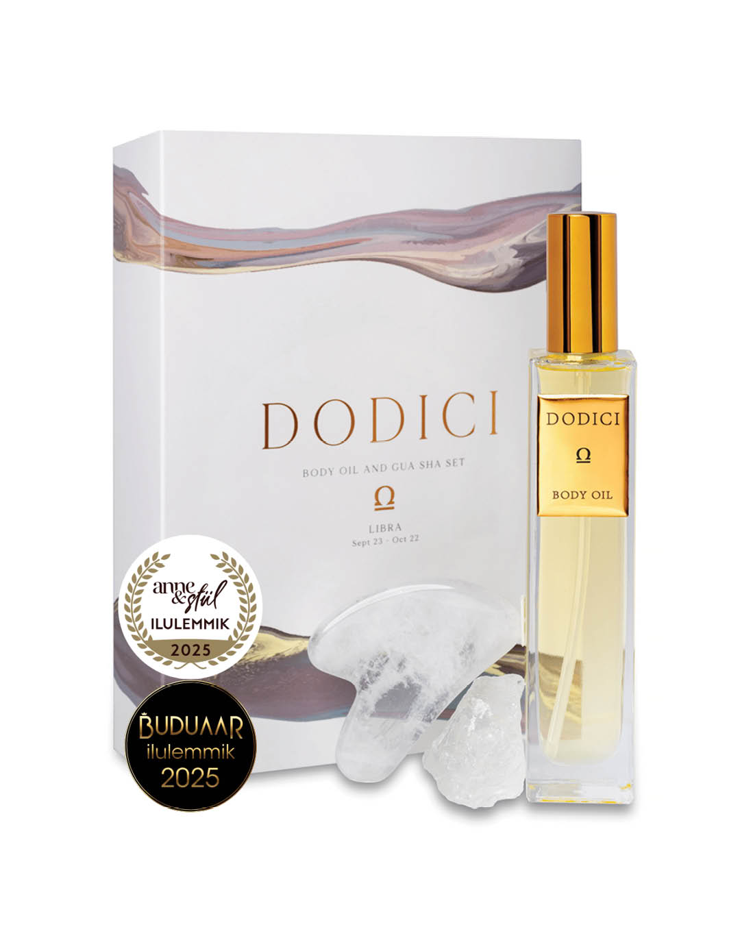 Dodici kerge ja kiiresti imenduv multifunktsionaalne keha- ja näoõli (100 ml) on siidine ja luksuslik hoolitsus, mis niisutab ja toidab nahka sügavuti, tugevdab kaitsebarjääri ning toetab säravat jumet, samal ajal kui mahe ja värskendavalt lilleline aroom loob harmoonilise ning meeli rahustava ilurituaali. Komplekti kuuluv mäekristallist gua sha massaažikivi parandab koos eeterlike õlidega rikastatud õliga vereringet, leevendab lihaspingeid ja suurendab heaolutunnet ning mäekristallist õnnekristall toetab selgust ja sisemist tasakaalu nii kandmisel kui meditatsioonis. Õli sisaldab sertifitseeritud orgaanilist magusa mandli õli, geraaniumi, palmaroosi ja ylang-ylangi eeterlikke õlisid, mis tasakaalustavad rasueritust, rahustavad ärritusi ja toetavad naha uuenemist, ning E-vitamiini kui tugevat antioksüdanti. Kaaludele loodud ilurituaal aitab hoida naha säravana ning meele rahuliku ja selgena, toetades loomulikku ilu ja sisemist harmooniat. Õli kanna kehale niiskele nahale pärast pesemist või näole üks pumbatäis puhtale nahale või koos näokreemiga, vältides silmaümbrust; parima tulemuse annab gua sha massaaž. Toode on 100% orgaaniline, vegan, julmusevaba ning valmistatud Prantsusmaalt pärit toorainest. Koostis: Helianthus Annuus Seed Oil; Geraniol**; Benzyl Benzoate**; Linalool**; Citronellol*. * koostisaine sertifitseeritud orgaanilisest õlist. ** esineb looduslikult.