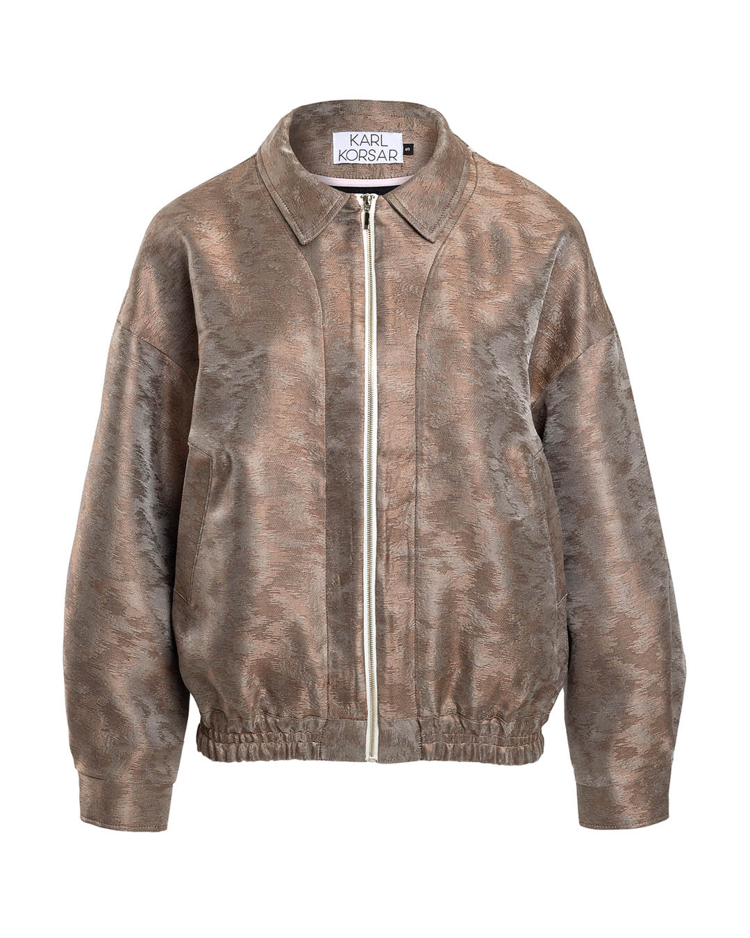 Karl Korsari bomber-stiilis jakk on valmistatud kahekordsest villa-siidisegu žakaarkangast, mis ühendab klassikalise käsitööoskuse ja kaasaegse moe, muutes selle väljapeetud ja luksuslikku elegantsi õhkavaks statement-rõivaesemeks. Valmistatud kõrgeima kvaliteediga villa-siidisegu žakaarkangast, on see jakk omaette meistriteos. Žakaarkude loob kangasse rikkaliku ja detailse mustri, lisades üldisele tekstuurile luksuslikku sügavust. Siidi õrn läige võimendab visuaalset mõju, püüdes ja peegeldades valgust just õigel moel. Materjal: 67% vill, 33% siid.
