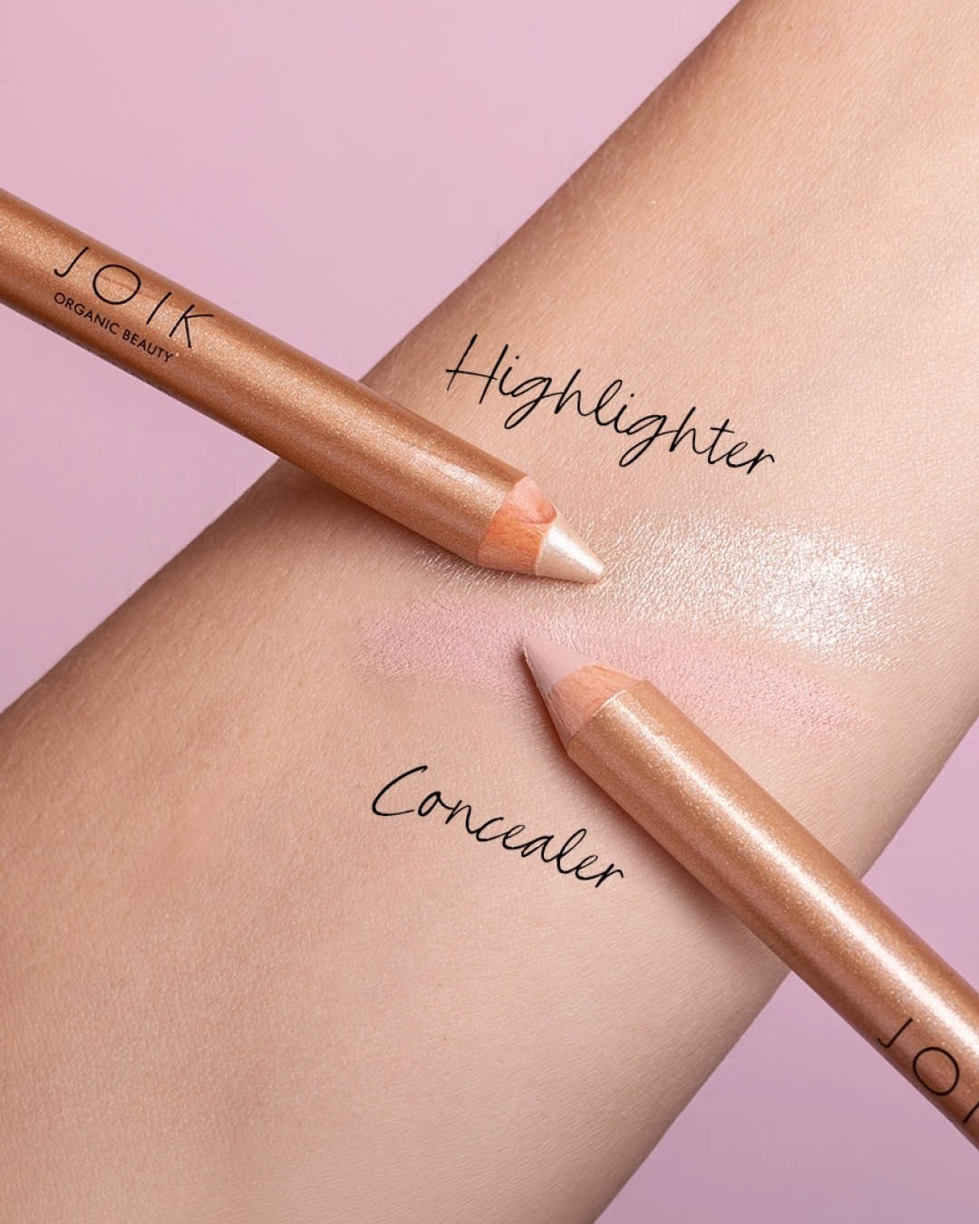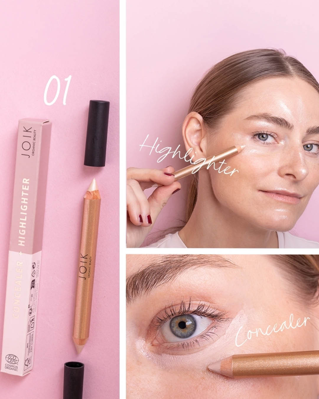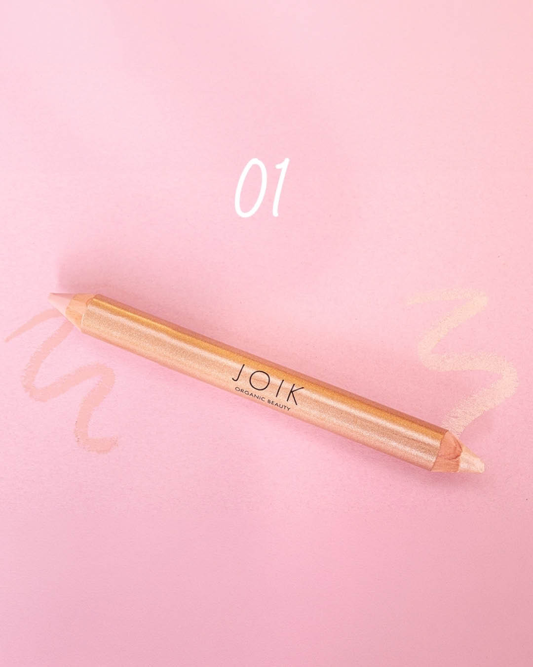 JOIKi kahepoolne sära- ja peitepulk aitab esile tuua naha loomuliku kuma ja peita väiksemaid iluvigu. Kreemjas koostis sulandub nahaga ühtlaselt ning toon 01 annab peitepulgale õrnalt roosaka alatooni ja särapulgale šampanjatooni sära. Särapulga koostis: Cocos Nucifera Oil*, Mica, Octyldodecyl Stearoyl Stearate, C10-18 Triglycerides, CI77891, Copernicia Cerifera Cera*, Silica, Tribehenin, Polyglyceryl-3 Diisostearate, Oryzanol, CI77491, Glyceryl Caprylate, Tocopherol. Peitepulga koostis: Peitepulga koostis: Octyldodecyl Stearoyl Stearate, CI77891, Cocos Nucifera Oil*, C10-18 Triglycerides, Copernicia Cerifera Cera*, Silica, Hydrogenated Vegetable Oil, Polyglyceryl-3 Diisostearate, Oryzanol, CI77492, CI77491, Tocopherol, Glyceryl Caprylate, CI77499. * koostisosad on mahepõllundusest.