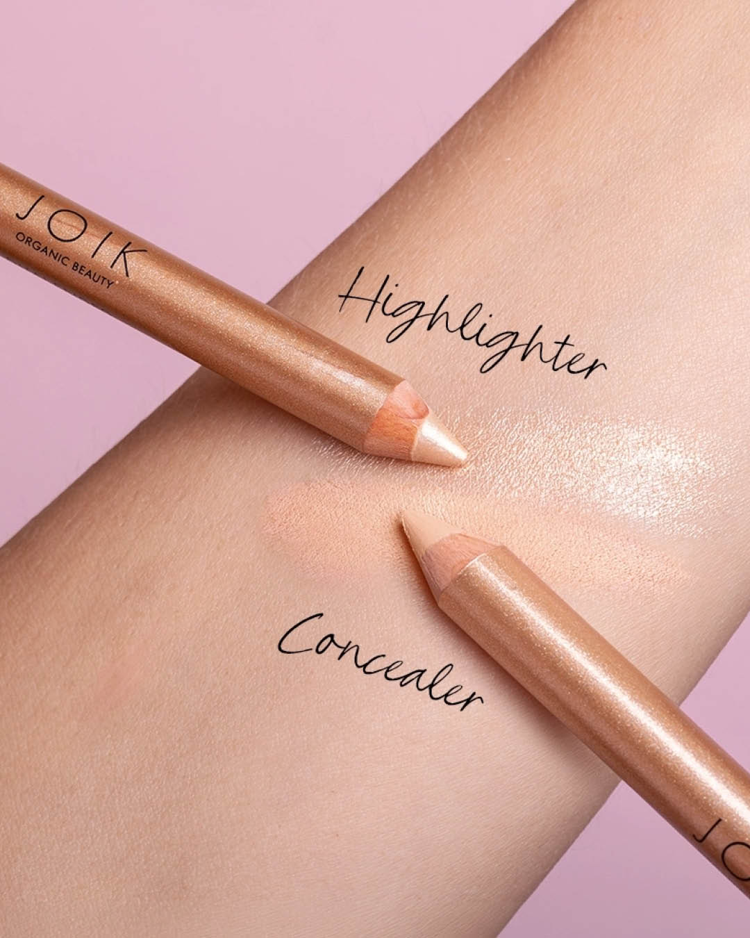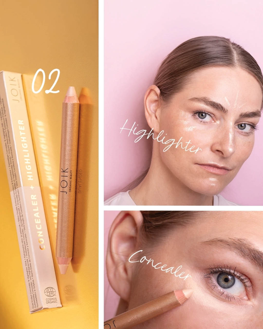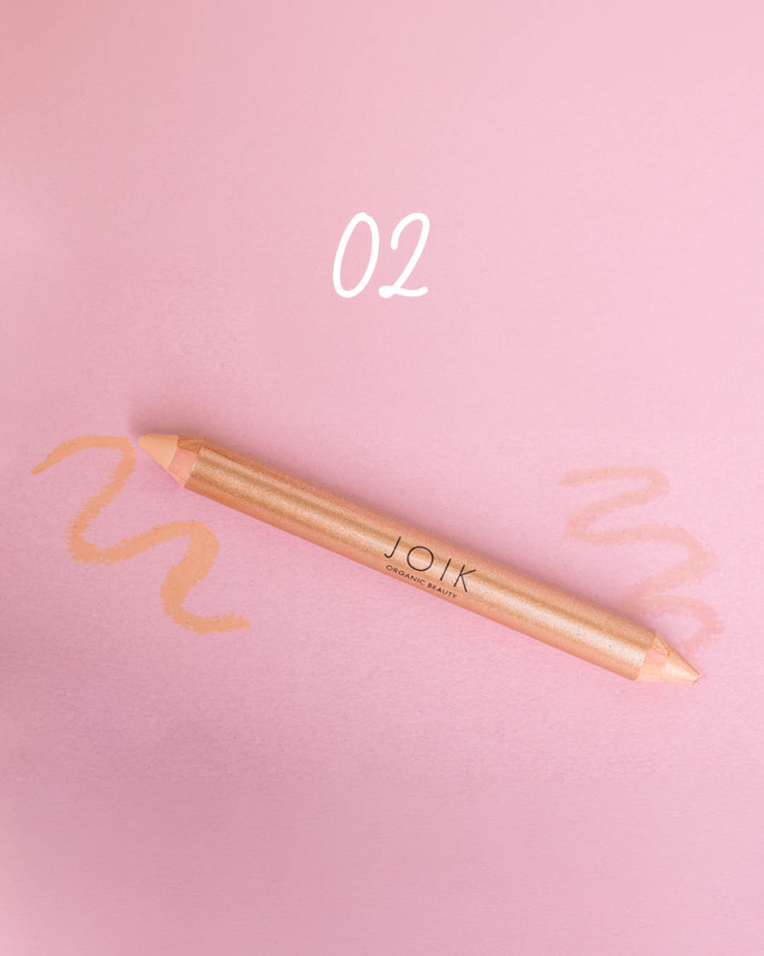 JOIKi kahepoolne sära- ja peitepulk aitab esile tuua naha loomuliku kuma ja peita väiksemaid iluvigu. Kreemjas koostis sulandub nahaga ühtlaselt ning toon 02 annab sooja alatooni peitepulgale ja kuldse kuma särapulgale. Särapulga koostis: Octyldodecyl Stearoyl Stearate, Cocos Nucifera Oil*, Mica, Copernicia Cerifera Cera*, C10-18 Triglycerides, CI77891, Silica, Hydrogenated Vegetable Oil, Polyglyceryl-3 Diisostearate, Oryzanol, Glyceryl Caprylate, Tocopherol, CI77491. Peitepulga koostis: CI77891, Cocos Nucifera Oil*, Octyldodecyl Stearoyl Stearate, C10-18 Triglycerides, Copernicia Cerifera Cera*, Silica, Hydrogenated Vegetable Oil, Polyglyceryl-3 Diisostearate, CI77492, Oryzanol, CI77491, Tocopherol, Glyceryl Caprylate, CI77499. * koostisosad on mahepõllundusest.