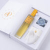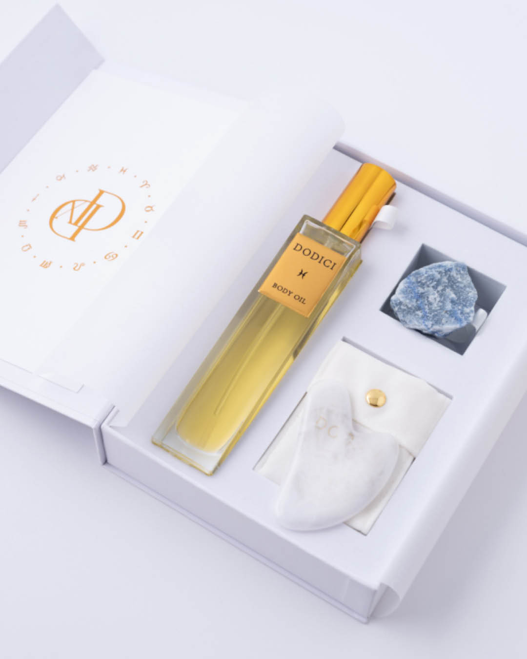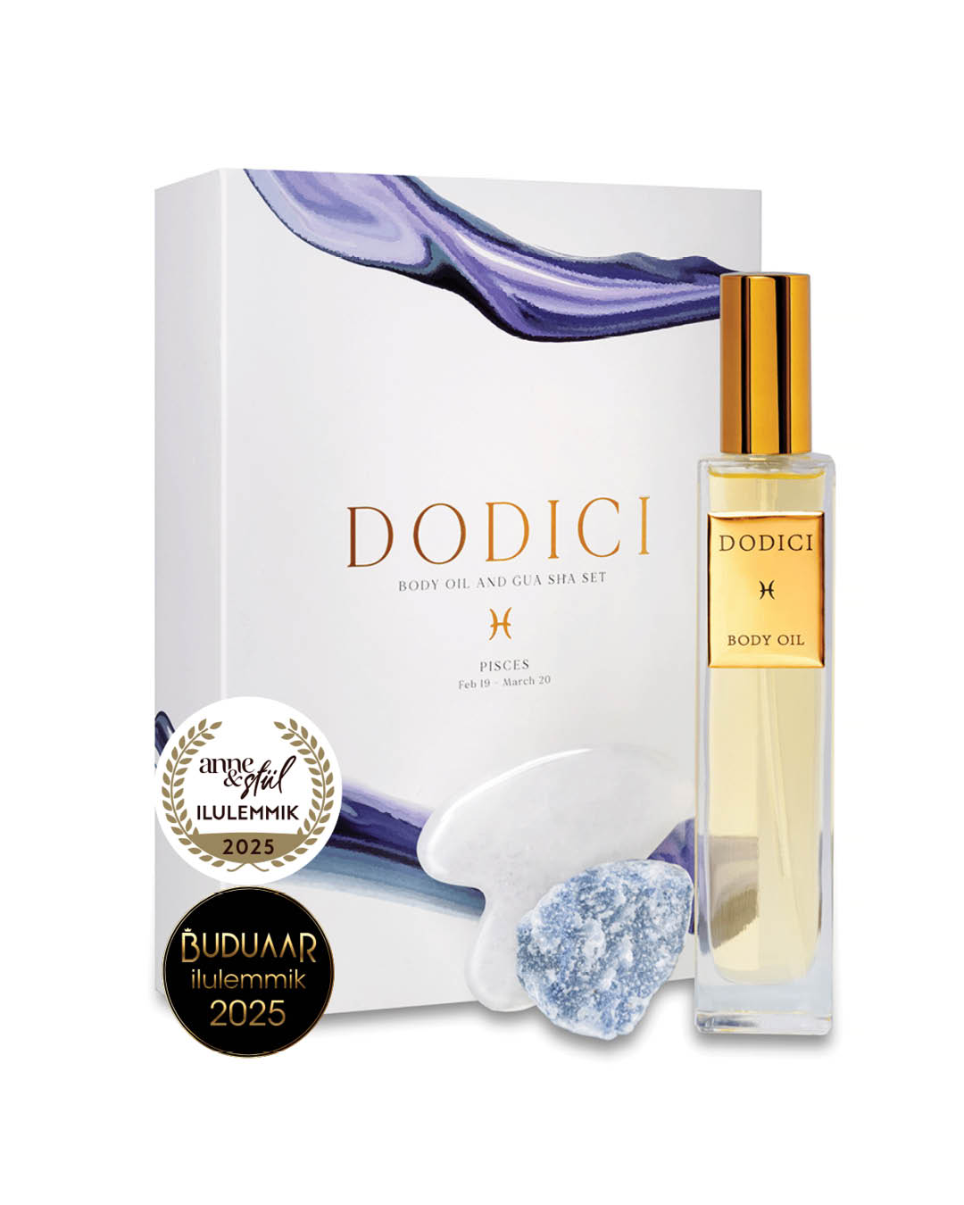 Dodici kerge ja kiiresti imenduv multifunktsionaalne keha- ja näoõli (100 ml) on siidine ja luksuslik kooslus, mis niisutab ja toidab nahka sügavuti, tugevdab kaitsebarjääri ning toetab loomulikku sära, samal ajal kui õrn sensuaalne lille-puidune aroom loob rahuliku ilurituaali. Komplekti kuuluv mäekristallist gua sha massaažikivi koos eeterlike õlidega rikastatud õliga parandab vereringet, leevendab lihaspingeid ja suurendab heaolutunnet ning sinine kvartsist õnnekristall sobib kandmiseks või meditatsiooniks, et toetada tasakaalu ja sisemist rahu. Õli sisaldab sertifitseeritud orgaanilist magusa mandli õli, mis pehmendab, niisutab ja tugevdab naha loomulikku kaitsevõimet, sandlipuu eeterlikku õli, mis rahustab ja toetab elastsust, jasmiini eeterlikku õli, mis tasakaalustab ja kirgastab jumet, ning E-vitamiini kui tugevat antioksüdanti, mis kaitseb nahka keskkonnamõjude eest. Kaladele sobiv ilurituaal toidab nii nahka kui hinge, pakkudes hetke vaikuseks ja taastumiseks ka kiirel päeval. Õli kanna kehale niiskele nahale pärast pesemist või näole üks pumbatäis puhtale nahale või koos näokreemiga, vältides silmaümbrust; parima tulemuse annab gua sha massaaž. Toode on 100% orgaaniline, vegan, julmusevaba ning valmistatud Prantsusmaalt pärit toorainest. Koostis: Helianthus Annuus Seed Oil; Benzyl Benzoate**; Linalool**; Farnesol**. * koostisaine sertifitseeritud orgaanilisest õlist. ** esineb looduslikult.