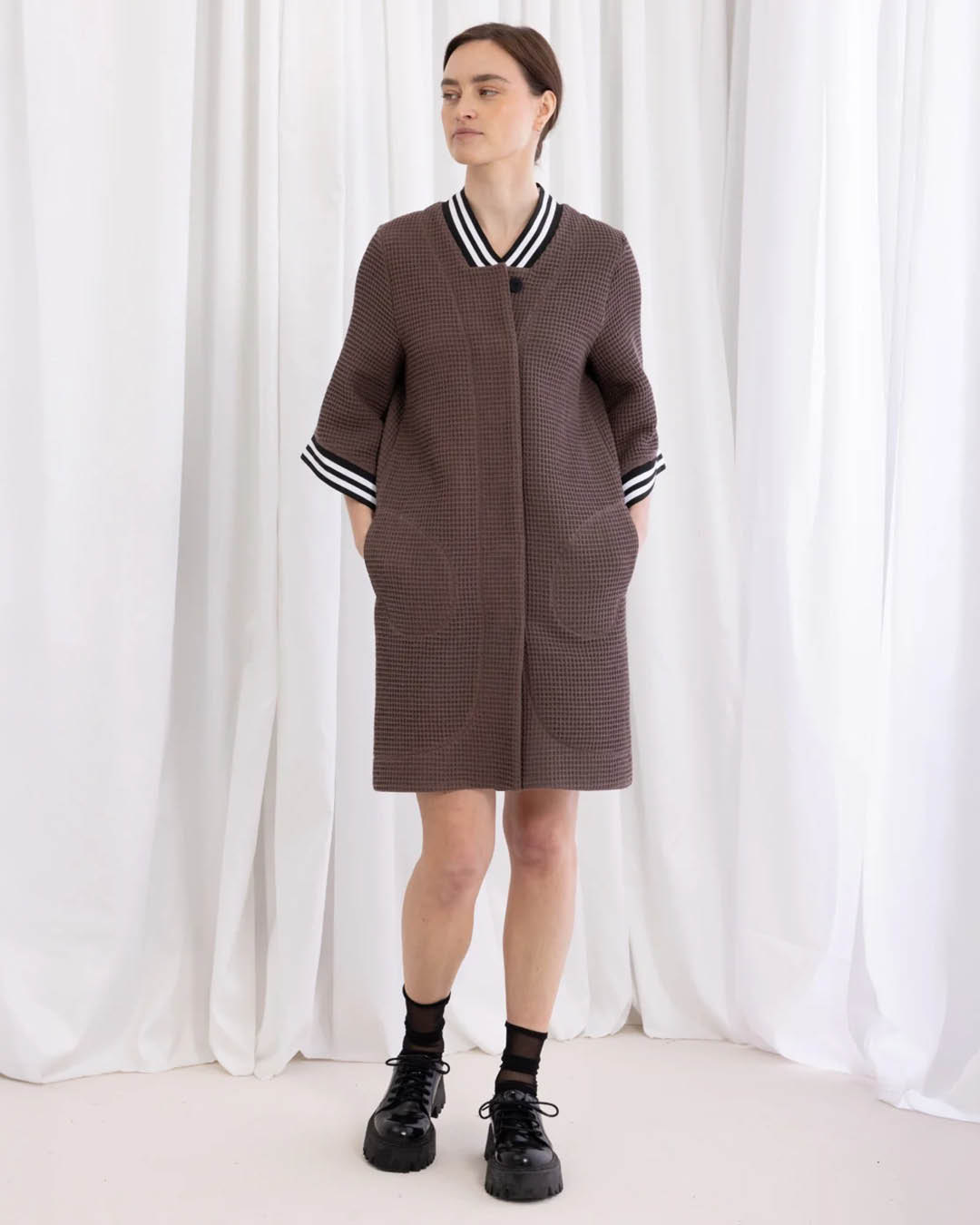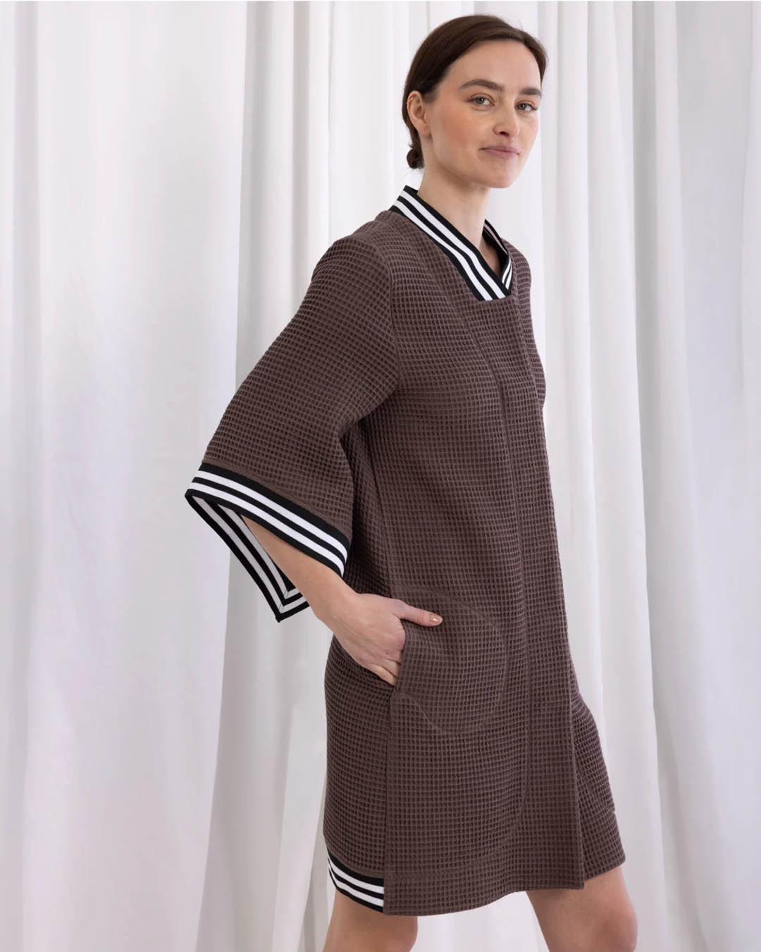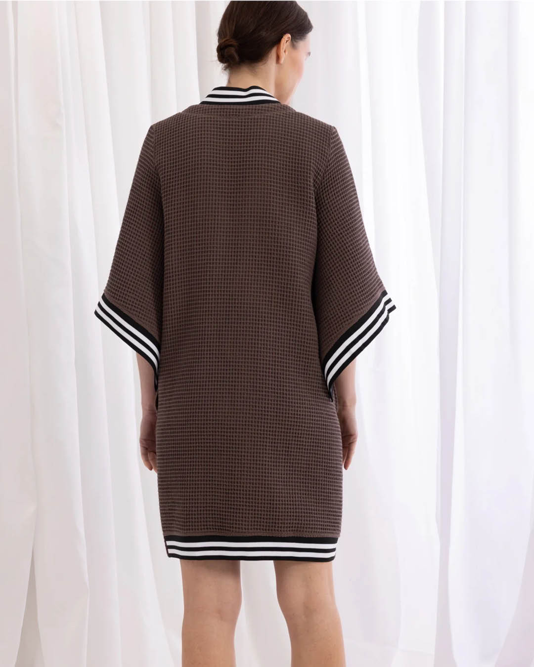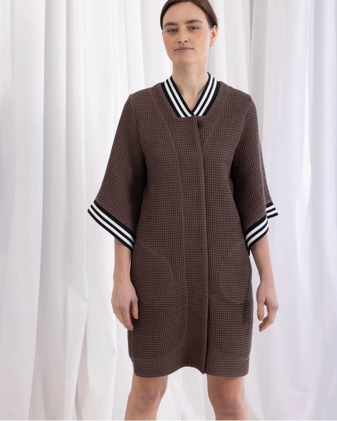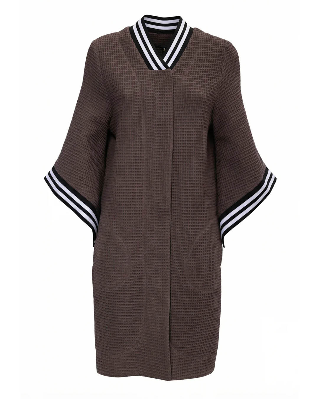 Kimono-stiilis hommikumantel Kriss Soonikult, mis sobib suurepäraselt ka lõbusaks suvejakiks. Valmistatud pehmest vahvlikoelisest puuvillast. Kaelus, varrukad ja mantli alumine seljaosa viimistletud soonikkandiga. Peidetud taskud. Ees peidetud nööpkinnis. Materjal: 100% Oeko-Tex Standard 100 sertifikaadiga puuvill. Ainult käsipesu. Pärast pesu venita tagasi vormi. Valmistatud Eestis.