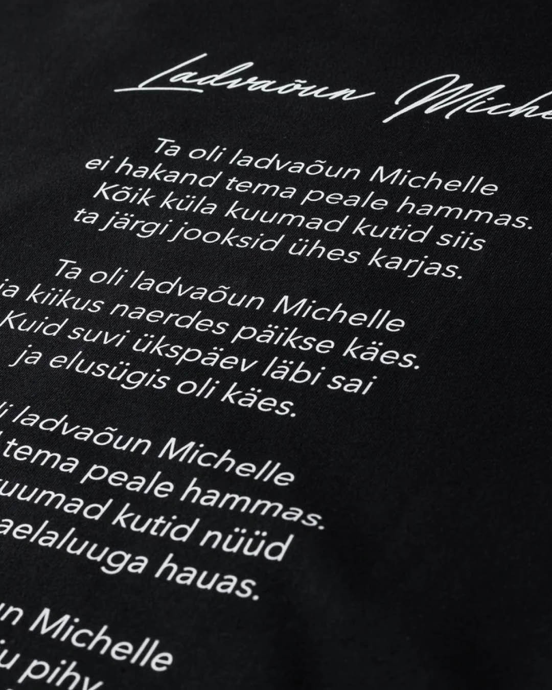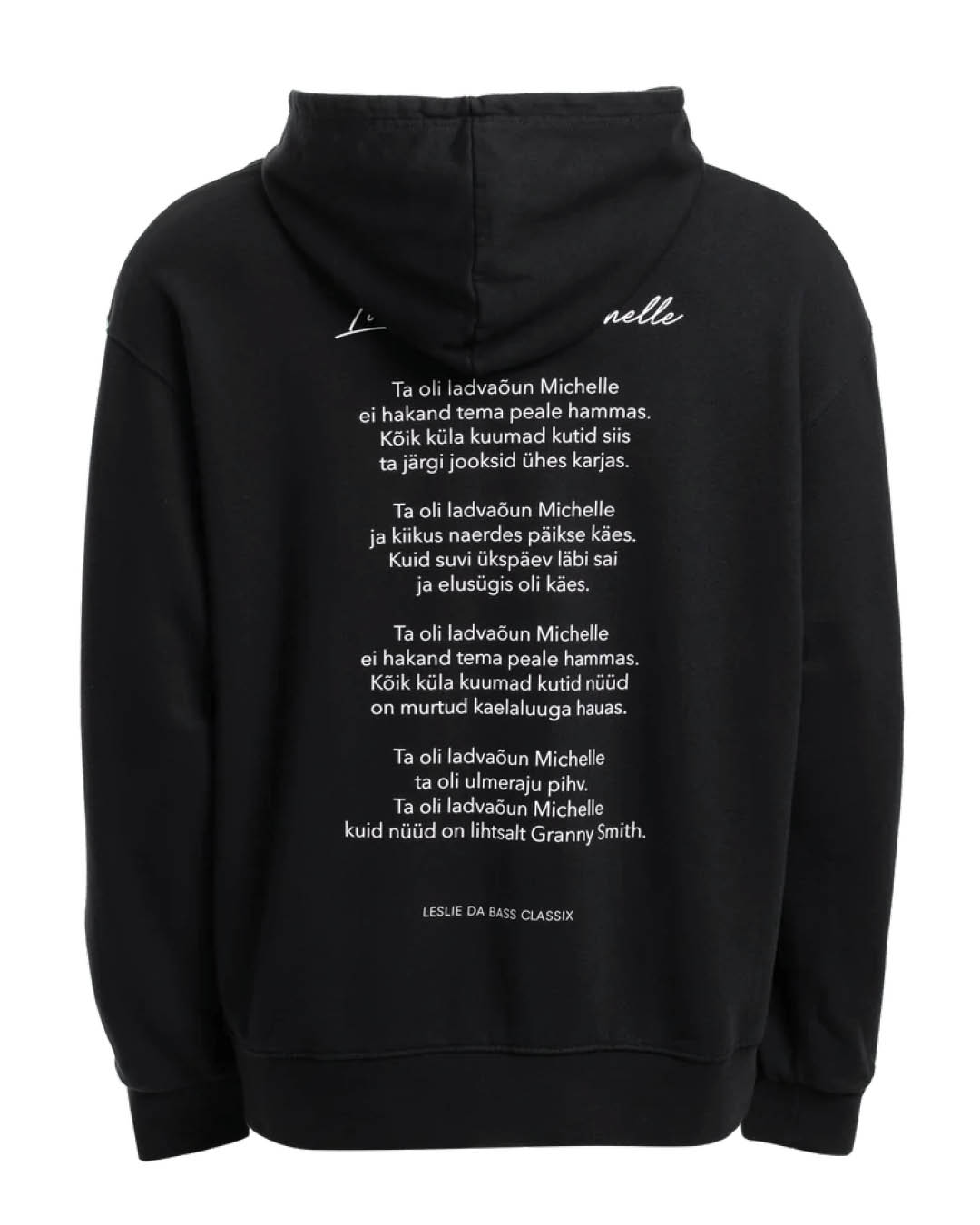 Eksklusiivse Marat x Leslie Da Bass kollektsiooni pusa “Ladvaõun Michelle”. Ees trükk, seljal loo tuntud read. Kängurutasku, kapuuts ja pehme puuvillane kangas. Tänavamoest inspireeritud mudel Eesti popkultuuri viitega. Materjal: 100% puuvill.