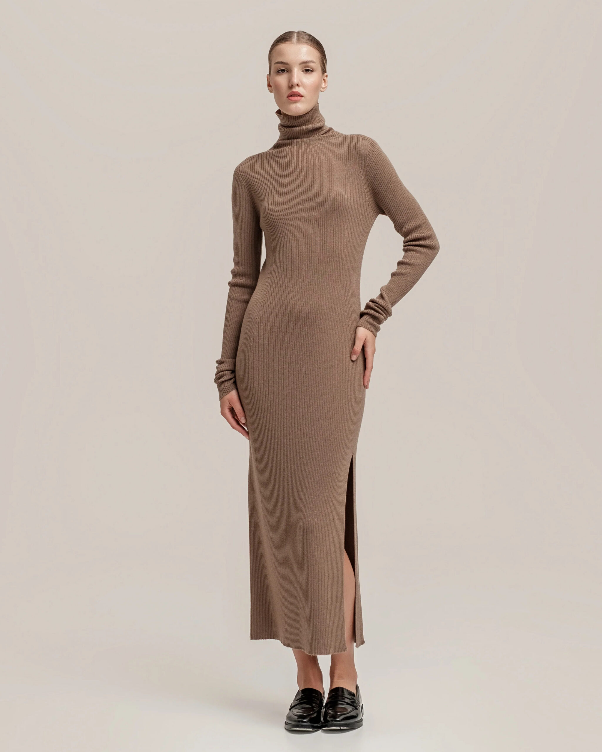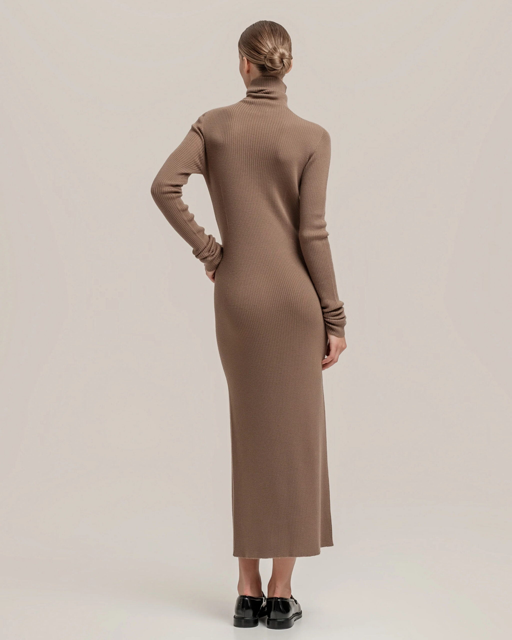 Meriinovillane Fjuge kleit Läti brändilt Verens. Kleit on kootud 3D õmblusteta kudumistehnoloogiaga pehmest 100% ekstrapeenest meriinovillast. Käsitsi valmistatud EL-is. Modell kannab EU S suurust, modelli pikkus on 174 cm.