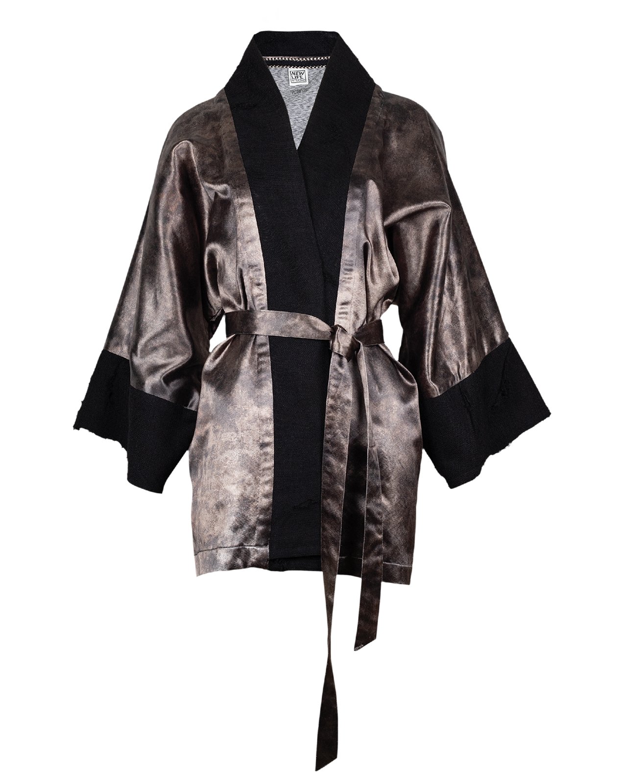 Metallik kimono. Onesize, sobib S-L kandjale. New Life Studio eesmärk on luua teadlikult; seetõttu on kõik materjalid taaskasutatud ja/või ümbertöödeldud. Nende missioon ei ole üksnes rõivaste loomine, vaid kunsti loomine, mida saab nautida nii vaadates kui ka kandes.