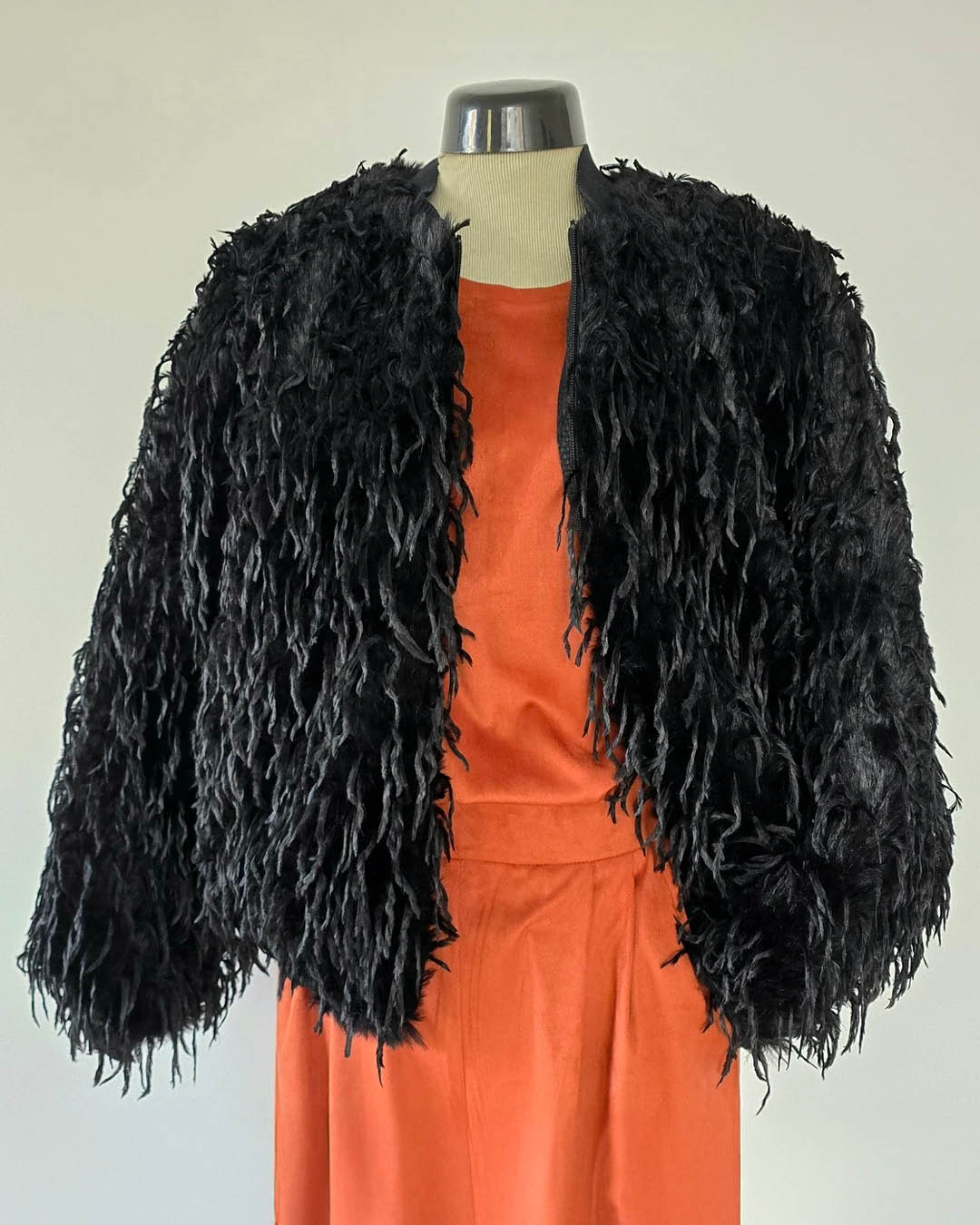 Mustast pikakarvalisest kangast bomberjakk disainerilt Raili Nõlvak. Alläär, krae ja varrukaotsad mustast soonikust. Voodriga. Küljeõmbluses taskud. Suurus 36 (rind 84 cm, talje 66 cm, puus 92 cm). Suurus 38 (rind 88 cm, talje 70 cm, puus 96 cm). Suurus 40 (rind 92 cm, talje 74 cm, puus 100 cm). Suurus 42 (rind 96 cm, talje 78 cm, puus 104 cm). Koostis: 75% PC, 25% PL. Vooder: 50% PL, 50% VI. Hooldus: keemiline puhastus.