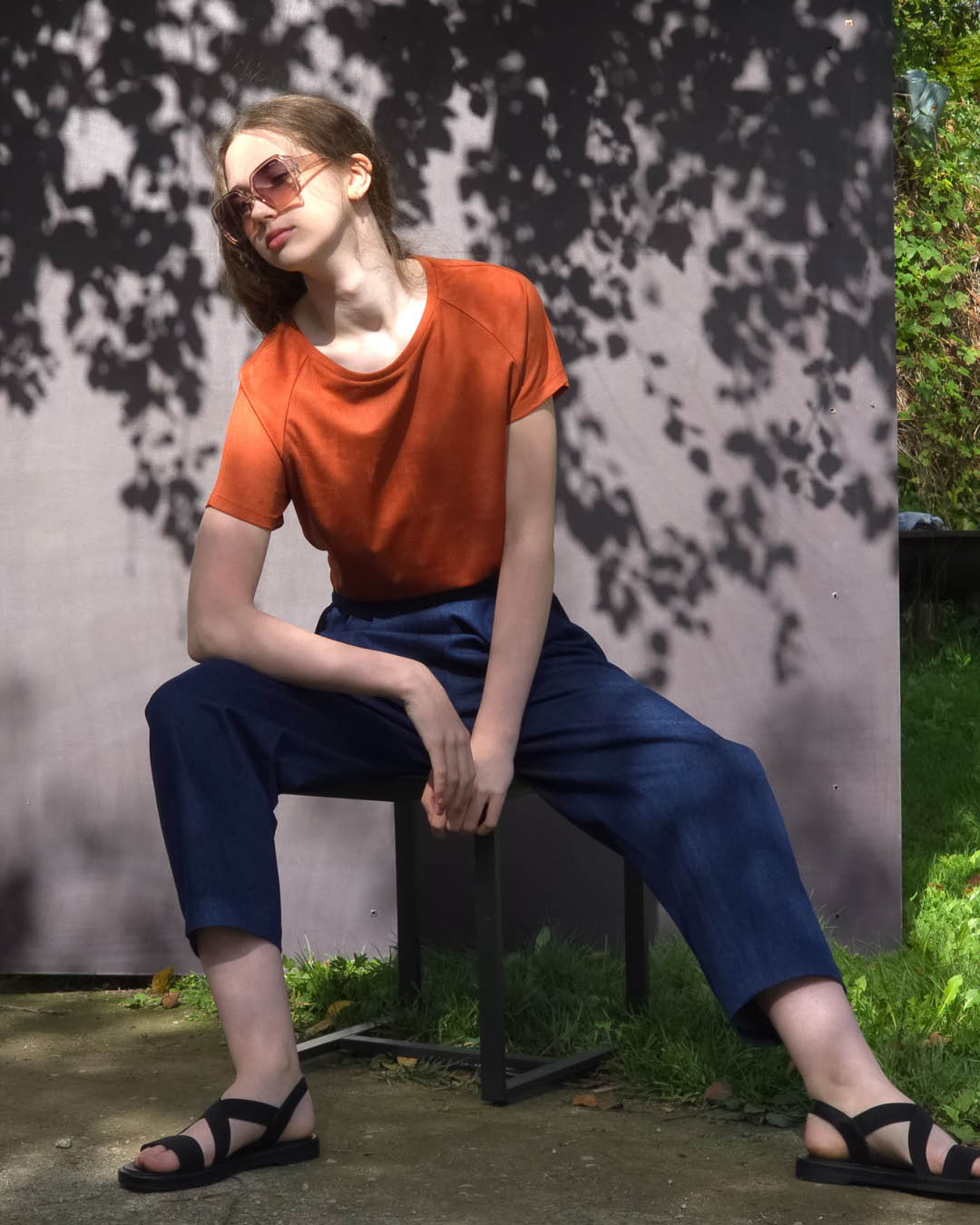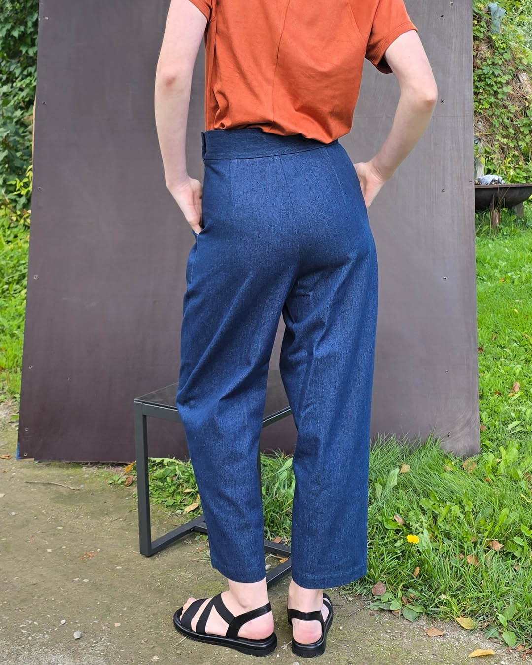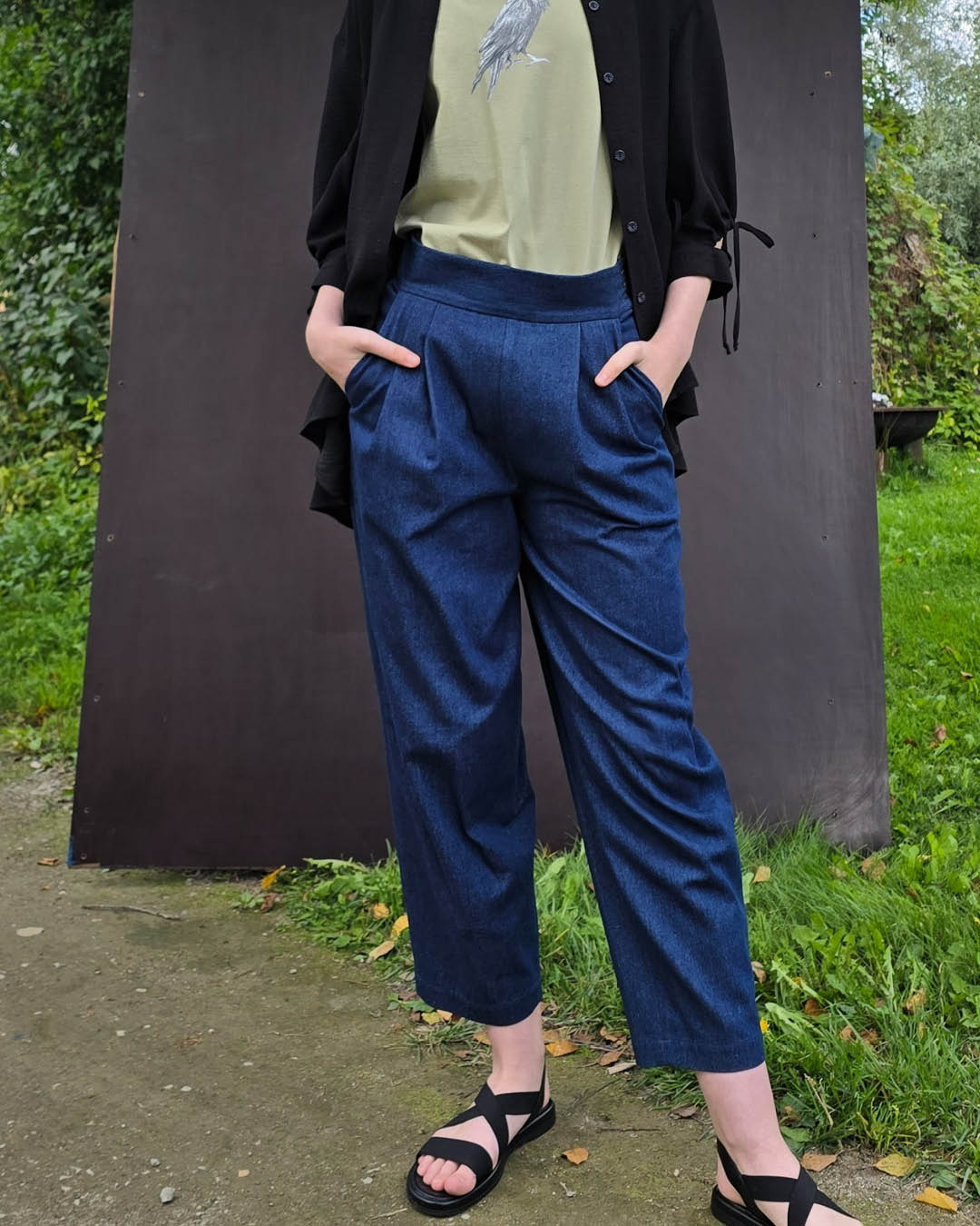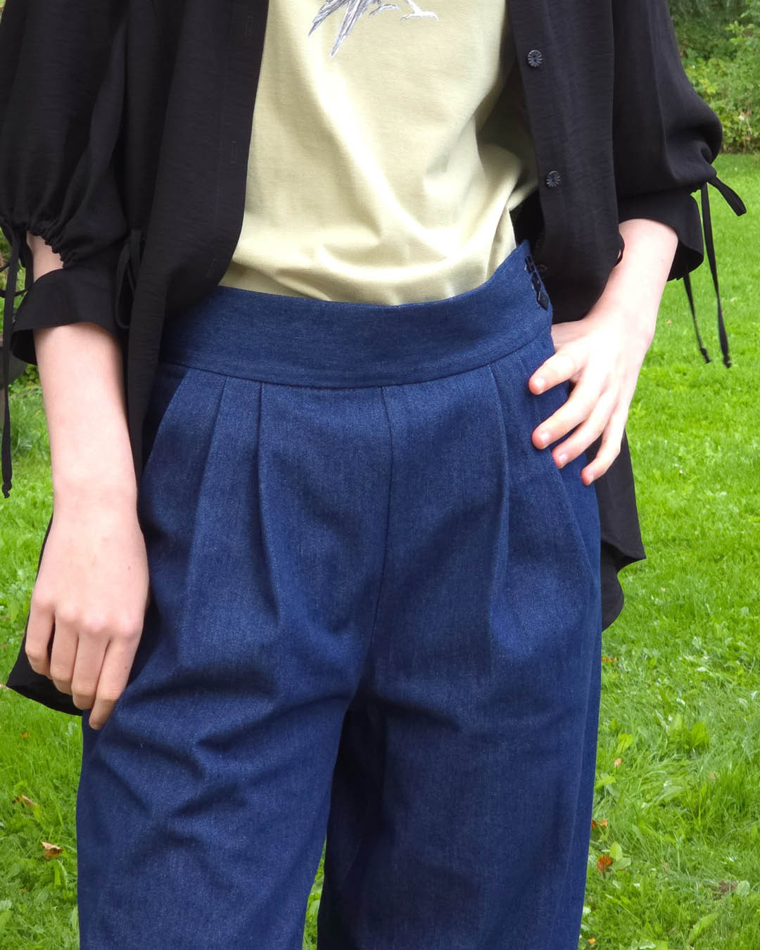 Laia värvliga, voltidega püksid disainerilt Raili Nõlvak. Värvlil 3 väikest nööpi. Lukk küljel. Taskutega.Tehtud tumesinisest pestud pehmest teksakangast. Alt kitseneva siluetiga sääred. Pikkus pahkluuni. Saadaval suurustes: 36 (talje 66 cm, puus 92 cm), 38 (talje 70 cm, puus 96 cm), 40 (talje 74 cm, puus 100 cm). Sisesääre pikkus: 71 cm. Sääre laius allservas: 21,5–23 cm. Koostis: teksakangas: 100% puuvill. Hooldus: õrn masinpesu lubatud. Modelli pikkus pildil 181 cm.