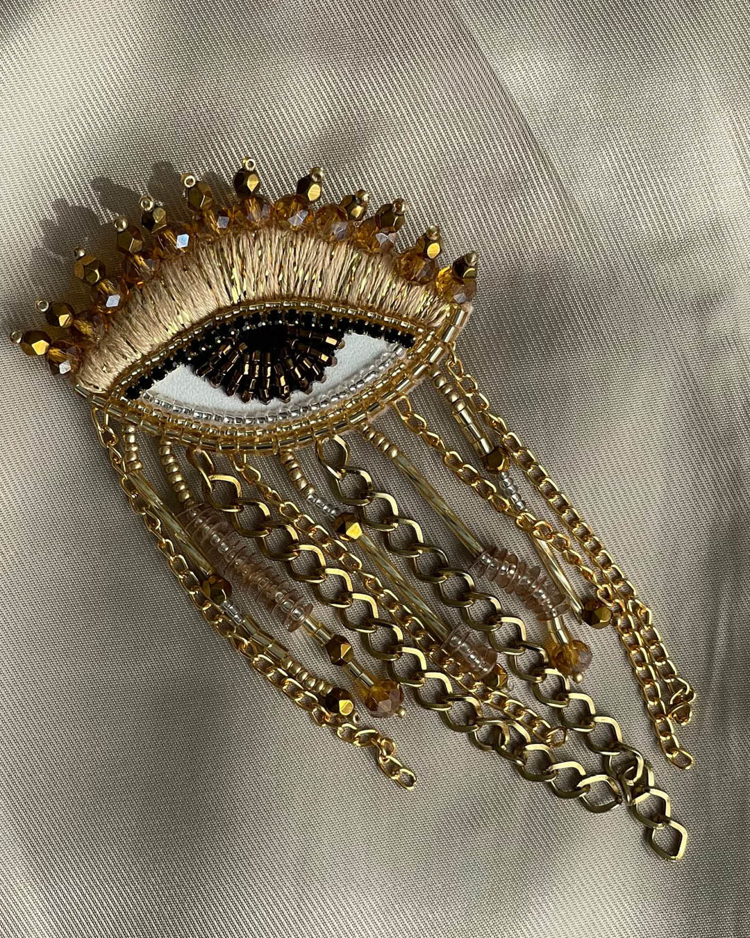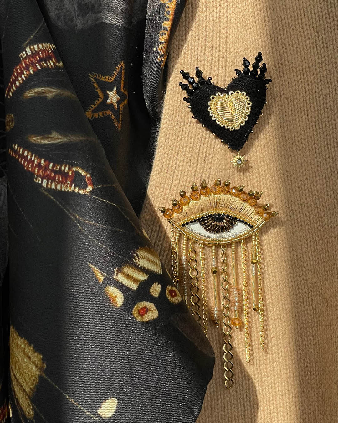 VETKA pross on käsitsi tikitud aksessuaar, mis tõstab esile ka lihtsama riietuse. Kvaliteetsed materjalid ja detailne töötlus annavad ehtele vastupidavuse ja erilise välimuse. Materjalid: naturaalnahk tagaküljel, klaashelmed, roostevabast terasest ketid. Suurus 5 × 11 cm koos rippuvate elementidega. Ehe tuleb koos kinkekarbiga.
