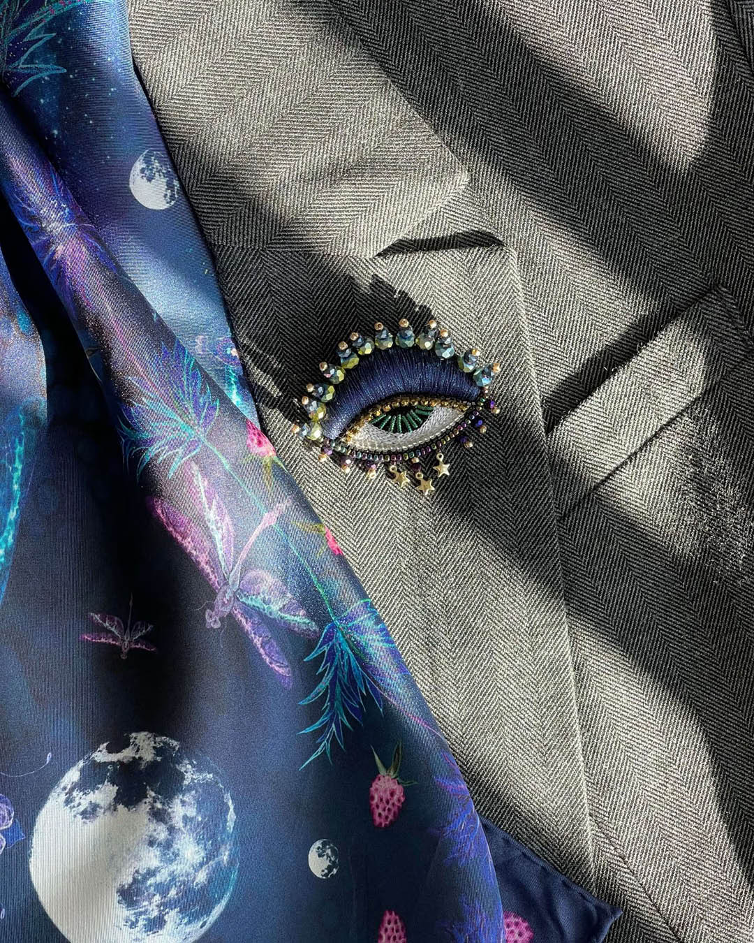 Käsitsi valmistatud VETKA pross ei ole lihtsalt ehe, vaid väike detail, mis muudab riietuse huvitavamaks. Tikand on tehtud hoolikalt ja armastusega ning iga pross on pisut erinev. Suurus 5 × 5,5 cm koos rippuvate elementidega. Ehe tuleb koos kinkekarbiga.