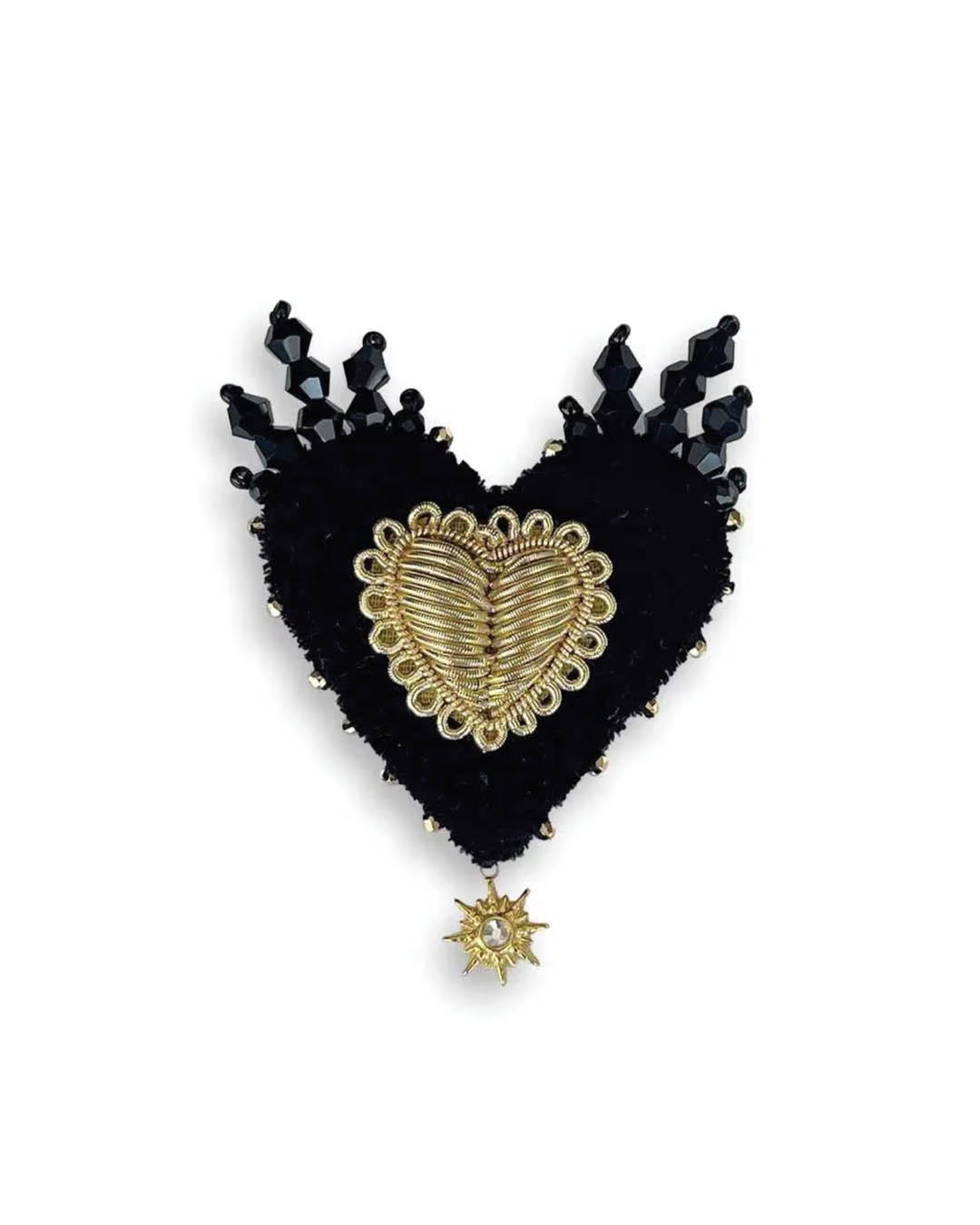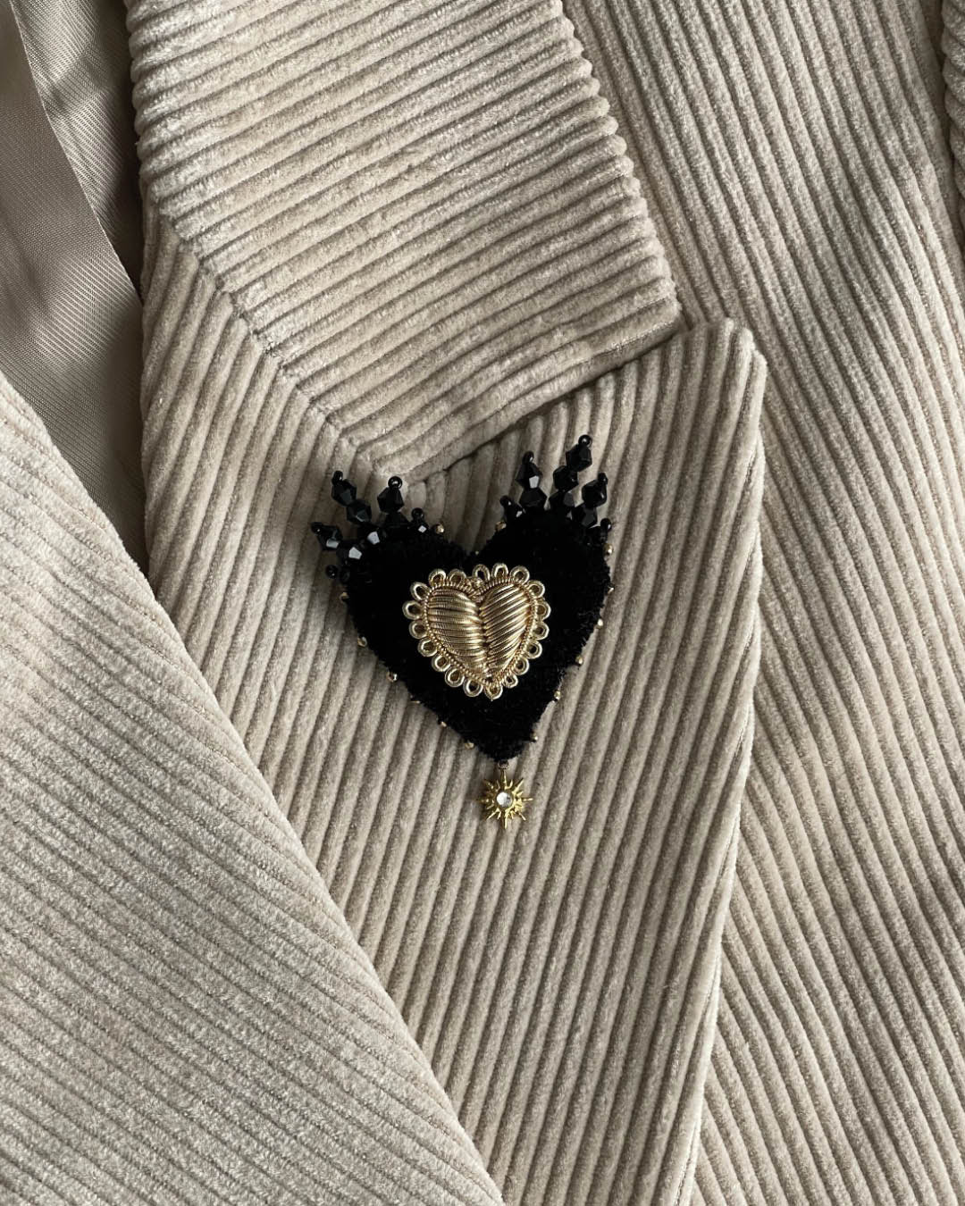 Pross Velvet Romance Vetkalt kuulub kollektsiooni Veil of the Night. Iga selle kollektsiooni ehe on kui sosin unustatud sajandist, käsitsi tikitud sümbolitega, mis on pärit võluväelugudest: täht – ajatu teejuht pimeduses, kandes endas soove, endeid ja valgust; süda – armastuse ja vaimu anum, mis tuksub igavesti mälestuste ja pühendumise rütmis; silm – iidne talisman, mis peletab kurja pilgu ja on igavesti avatud varjatud tõdedele. See on ajastutevaheline tõotus, mis on käsitsi õmmeldud aukartusega ning mõeldud kandmiseks neile, kes loevad endiselt tähendusi tähtedest. Suurus 6,5 x 4,5 cm (koos rippuvate elementidega). Käsitsi tikitud, loodud eksklusiivselt VETKA jaoks. Kaasas kinkekarp. Sametkangas, roostevabast terasest detailid, klaashelmed, hematiidikivid.