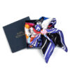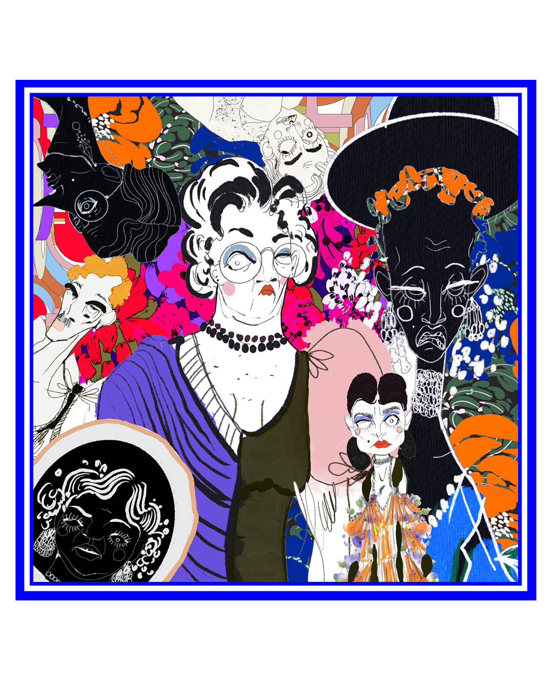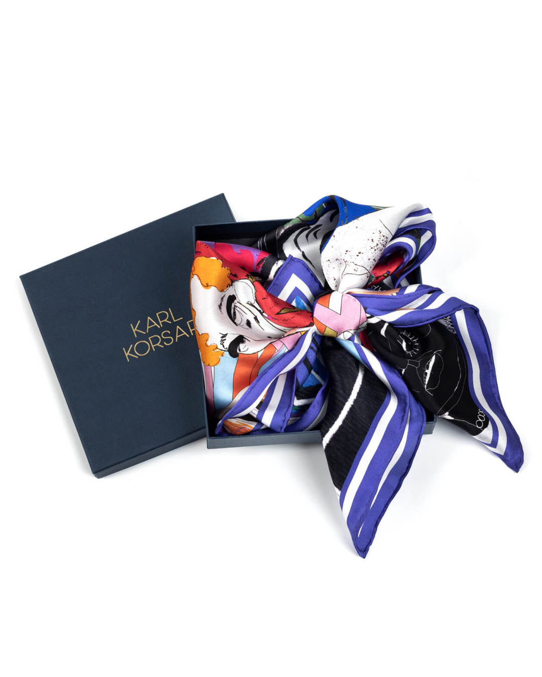 Siidsall „With My Favourite People” disainerilt Karl Korsar pakatab värvidest, isikupärast ja teatrilikust võlust. Illustratsioon koondab elava seltskonna stiliseeritud tegelasi, kellest igaüks on kujutatud liialdatud ilmete ja dramaatilise hoiakuga. Julged jooned, eklektiline mood ja erksad lillemustrid põimuvad, luues rõõmsalt kaootilise terviku. Stseeni keskmes olev figuur, ehitud pärlite ja prillidega ning poolrangelt, poolmänguliselt mõjuva ilmega, ankurdab kogu kompositsiooni. Teda ümbritsevad kaaslased, kelle omanäolised jooned ja väljendusrikkad näod vihjavad igaühe oma värvikale loole. Koos moodustavad nad mängulise, moeteadliku koosluse sõprusest, individuaalsusest ja loovast energiast. Materjal: 100% siid. Mõõdud: 68 × 68 cm.