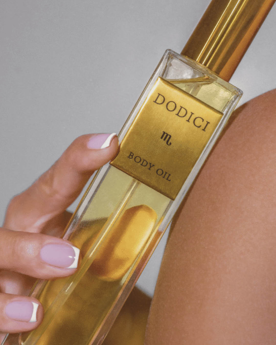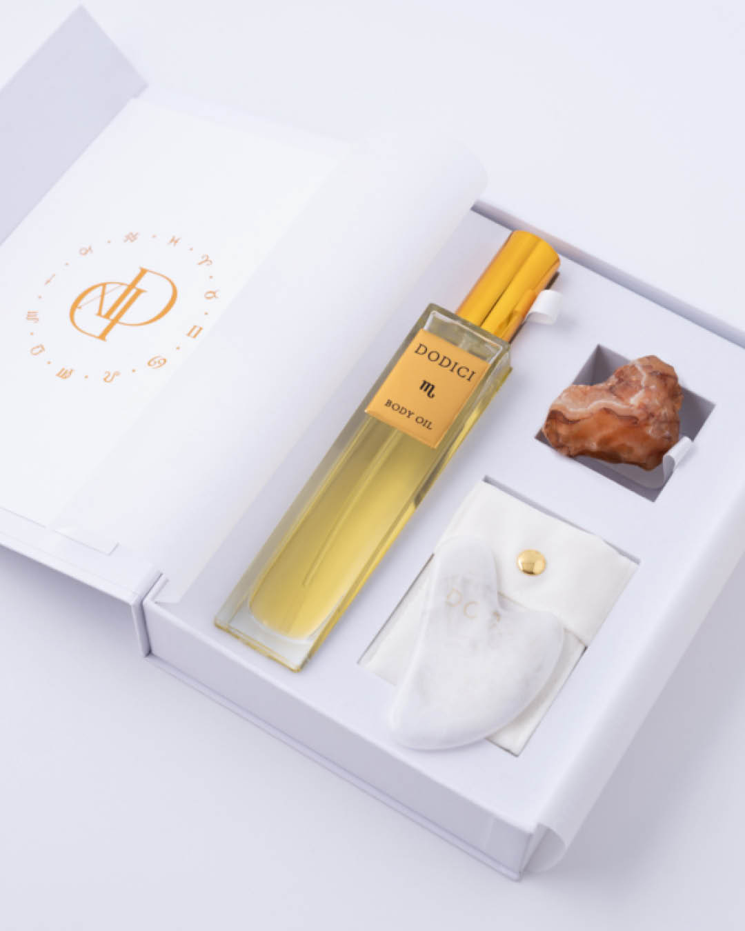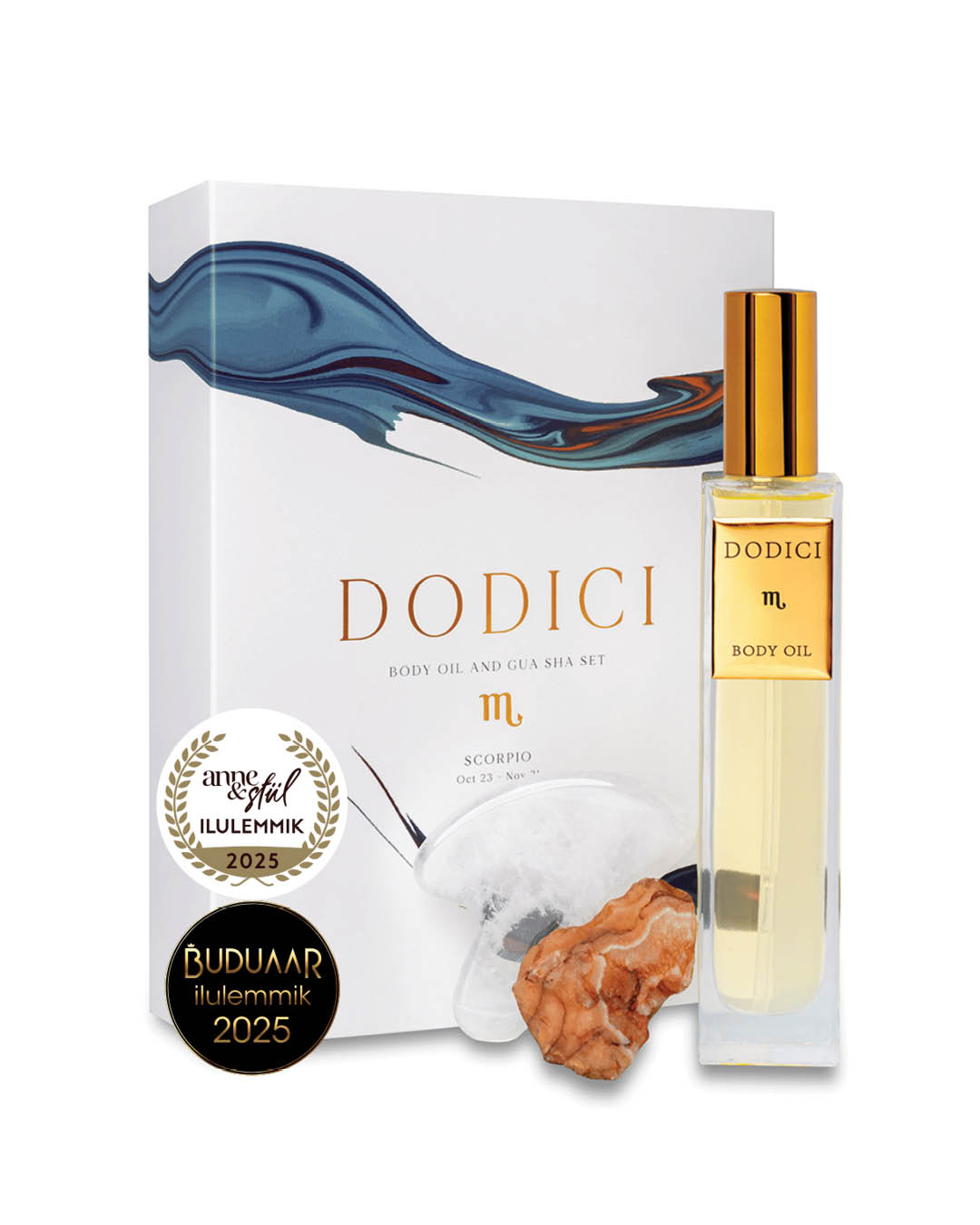 Dodici kerge ja kiiresti imenduv multifunktsionaalne keha- ja näoõli (100 ml) on siidine ja luksuslik hoolitsus, mis niisutab ja toidab nahka sügavuti, tugevdab kaitsebarjääri ning toetab säravat jumet, samal ajal kui soe vürtsikas ja metsalähedane aroom turgutab meeli ja annab elujõudu. Komplekti kuuluv mäekristallist gua sha massaažikivi parandab koos eeterlike õlidega rikastatud õliga vereringet, leevendab lihaspingeid ja suurendab heaolutunnet ning karneoolist õnnekristall toetab sisemist jõudu ja tasakaalu. Õli sisaldab sertifitseeritud orgaanilist magusa mandli õli, männi, kardemoni ja musta pipra eeterlikke õlisid, mis ergutavad, puhastavad ja toetavad naha uuenemist, ning E-vitamiini kui tugevat antioksüdanti. Skorpionile loodud ilurituaal pakub puhastavat ja taastavat hoolitsust, hoides naha ja meele selge, tasakaalus ja elujõulisena. Õli kanna kehale niiskele nahale pärast pesemist või näole üks pumbatäis puhtale nahale või koos näokreemiga, vältides silmaümbrust; parima tulemuse annab gua sha massaaž. Toode on 100% orgaaniline, vegan, julmusevaba ning valmistatud Prantsusmaalt pärit toorainest. Helianthus Annuus Seed Oil; Limonene**; Linalool**. * koostisaine sertifitseeritud orgaanilisest õlist. ** esineb looduslikult.