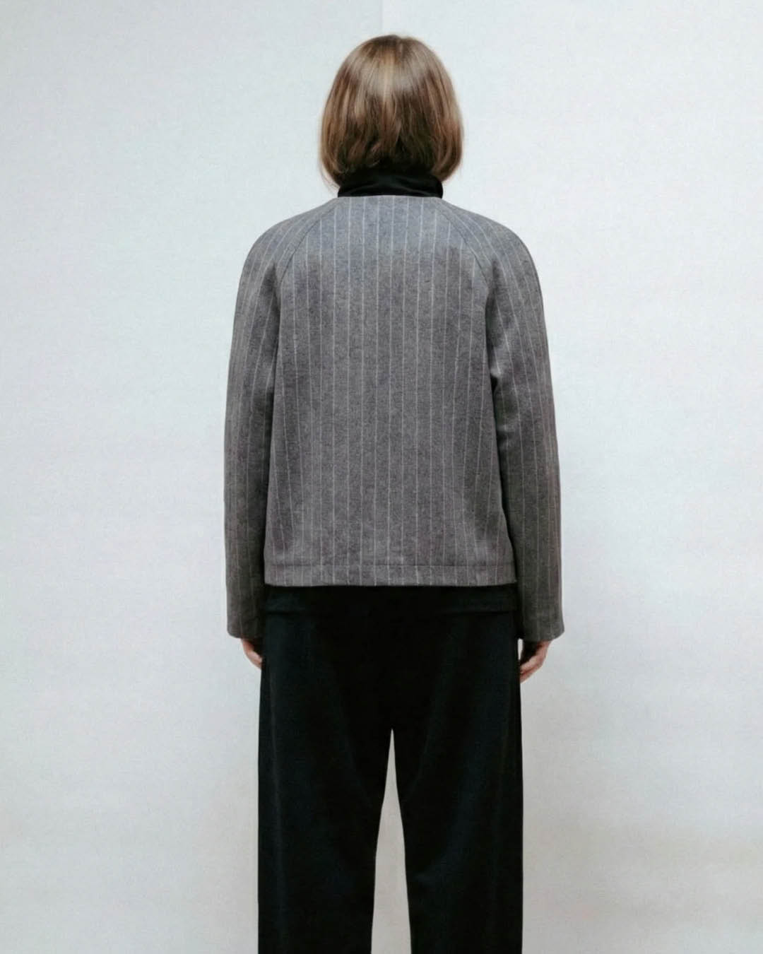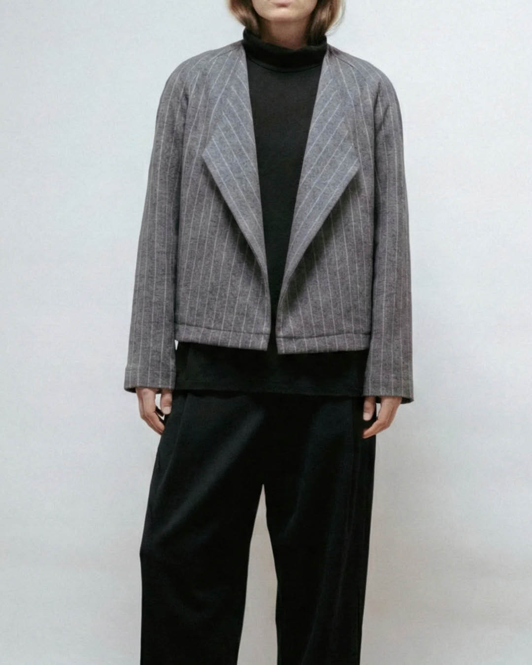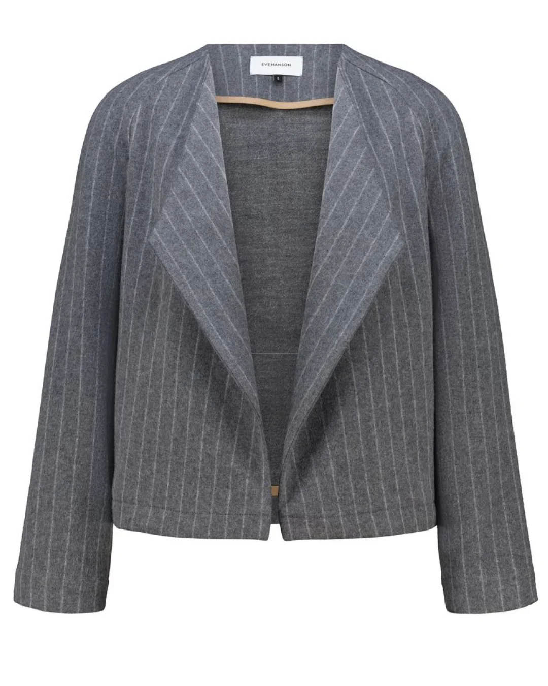Eve Hansoni kerge villakudumist jakk õrna triibuga, mis ühendab kudumi mugavuse ja puhta rätsepaliku joone. Kraeta kaelus ja avatud esiosa loovad modernse minimalistliku silueti. A-jooneline lõige ja raglaanvarrukad tagavad mugava istuvuse ning loomuliku liikumisvabaduse. Jakil on küljeõmblustaskud ja hoolikalt viimistletud siseõmblused. Valmistatud Eestis kangast, mille koostis on 95% neitsivill, 4% polüamiid ja 1% elastaan. S-suuruse seljapikkus on 56 cm. Soovitatav on keemiline puhastus.